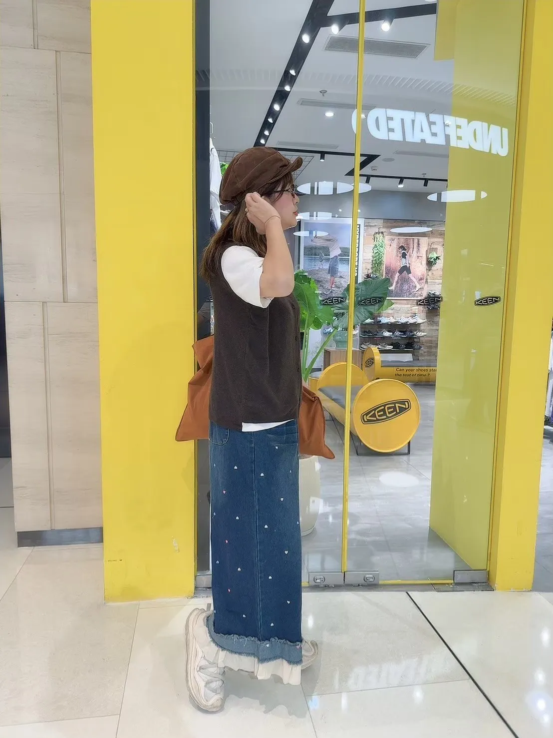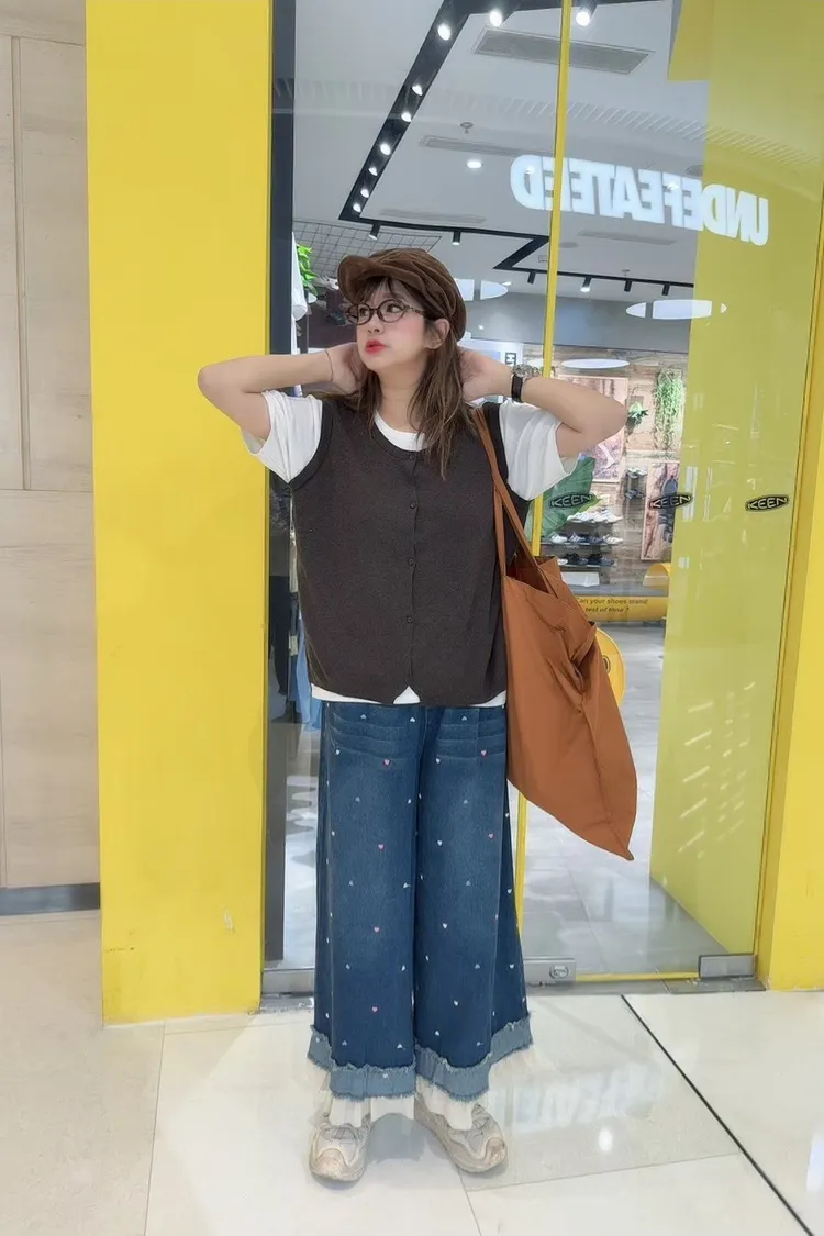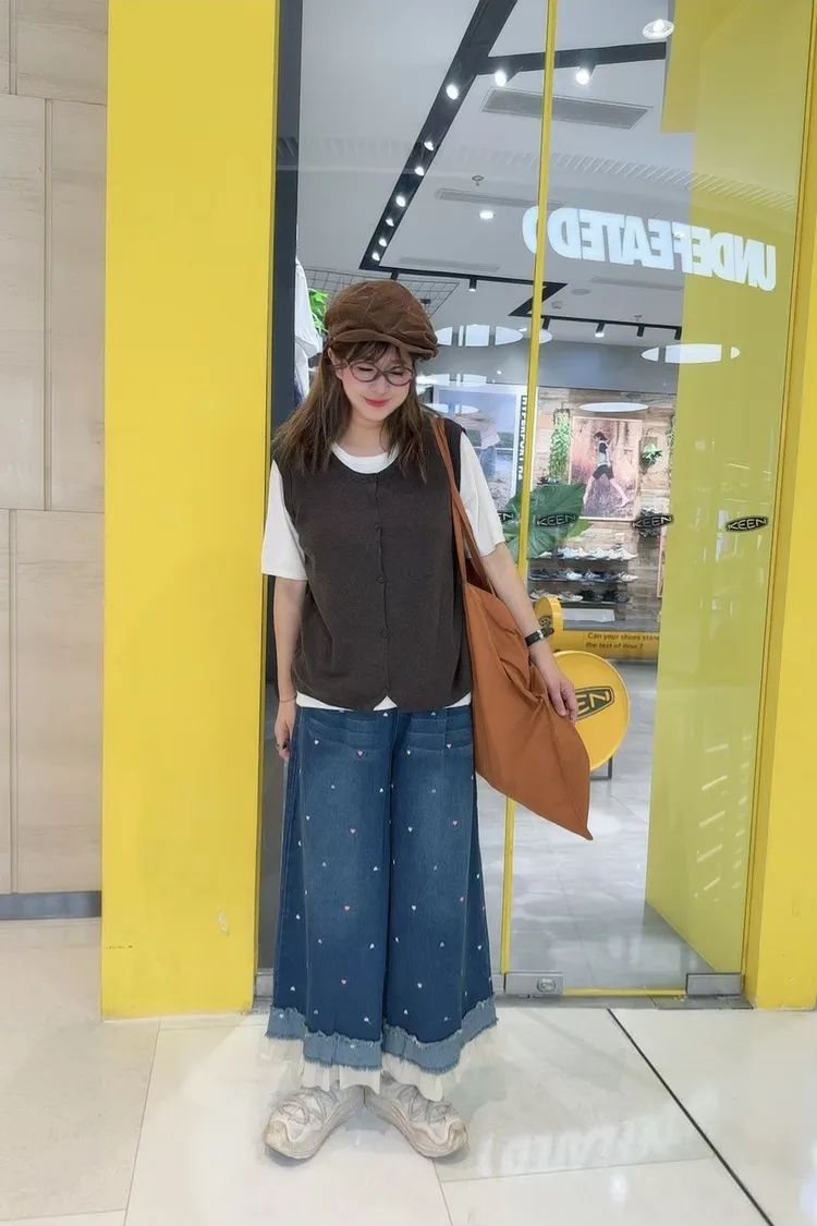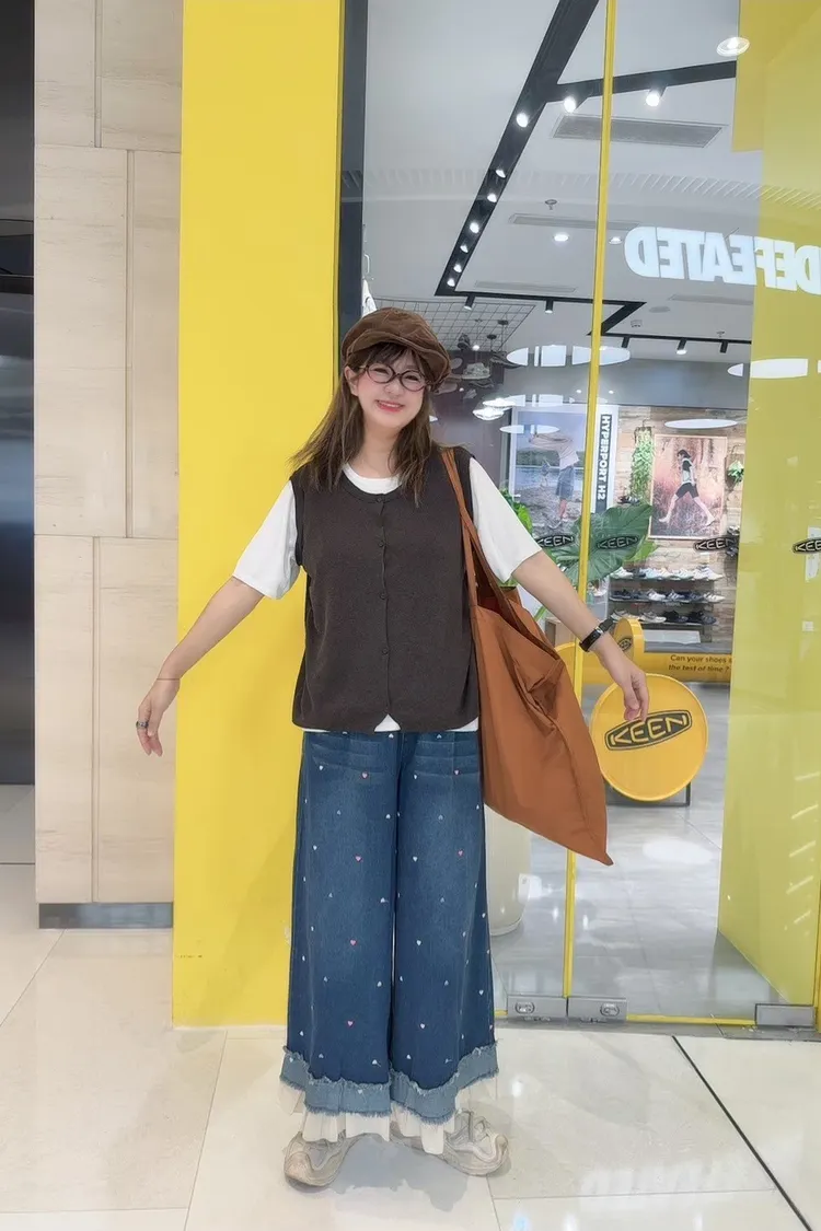 刺繡愛心荷葉拼接牛仔褲
