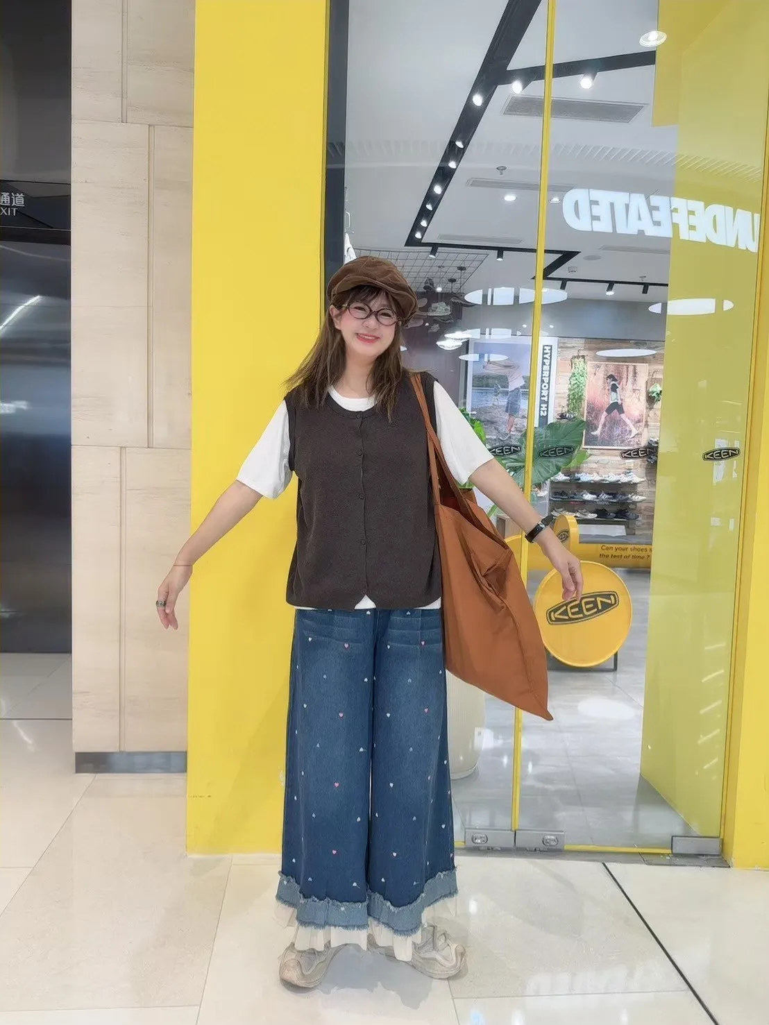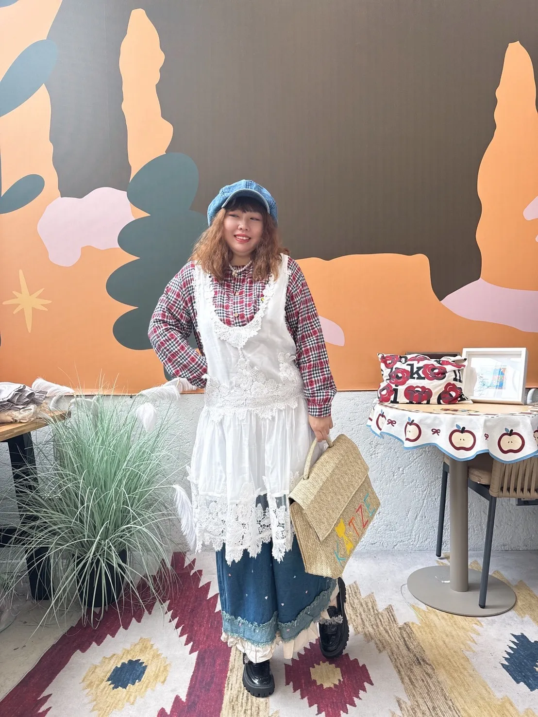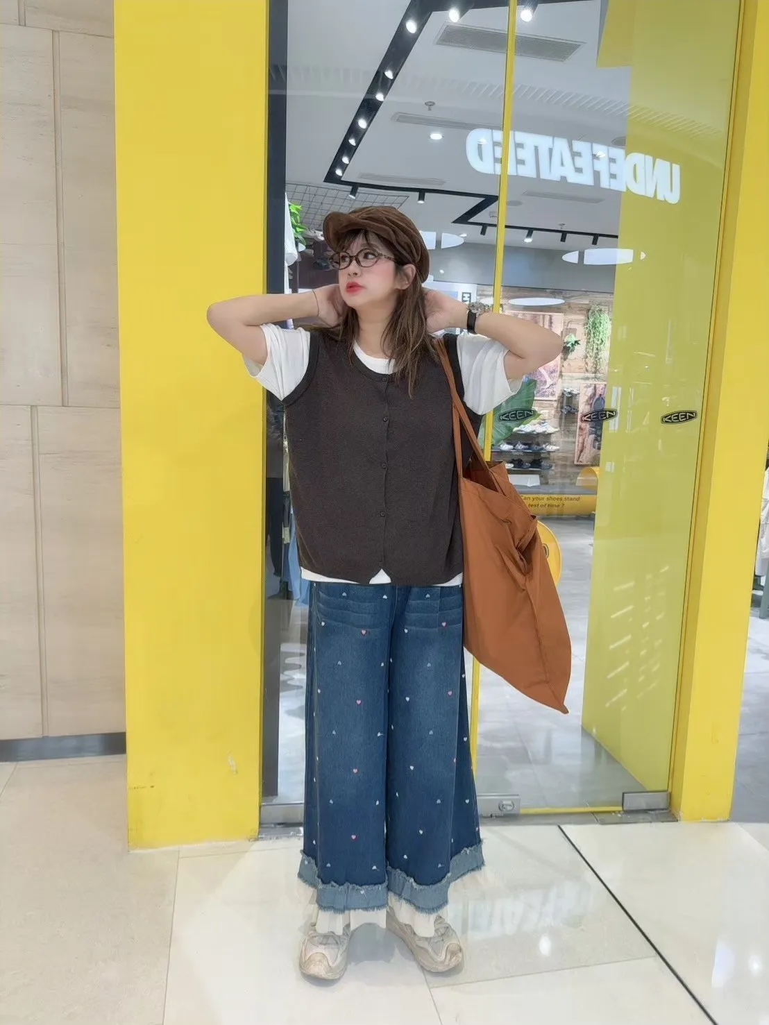 刺繡愛心荷葉拼接牛仔褲