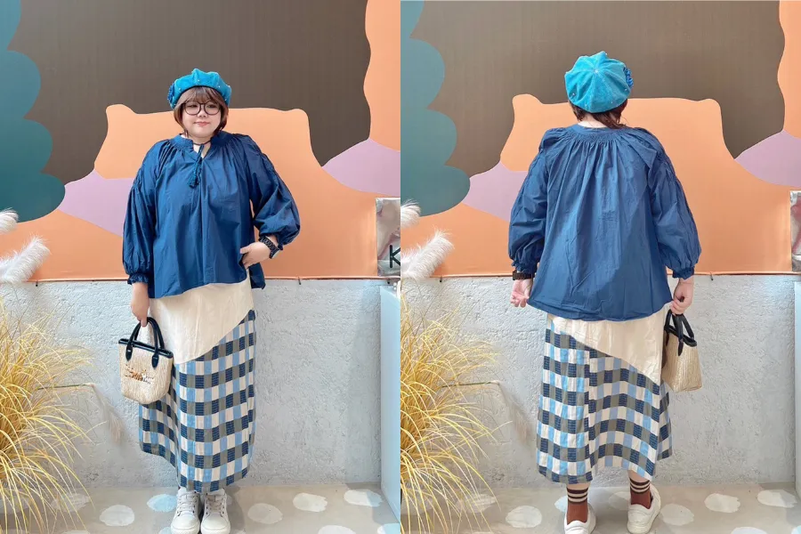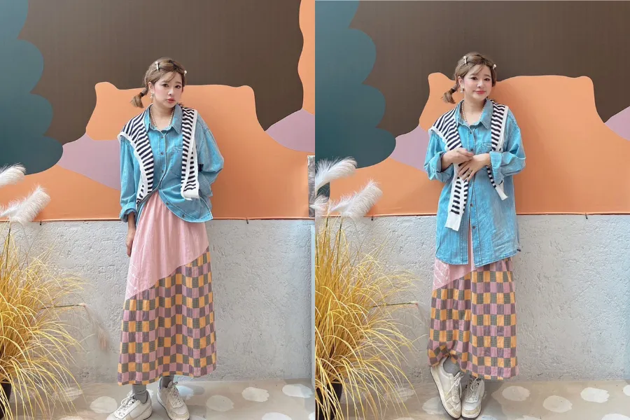 撞色方塊拼接格紋棉麻裙 2色
