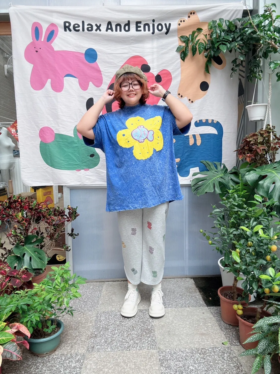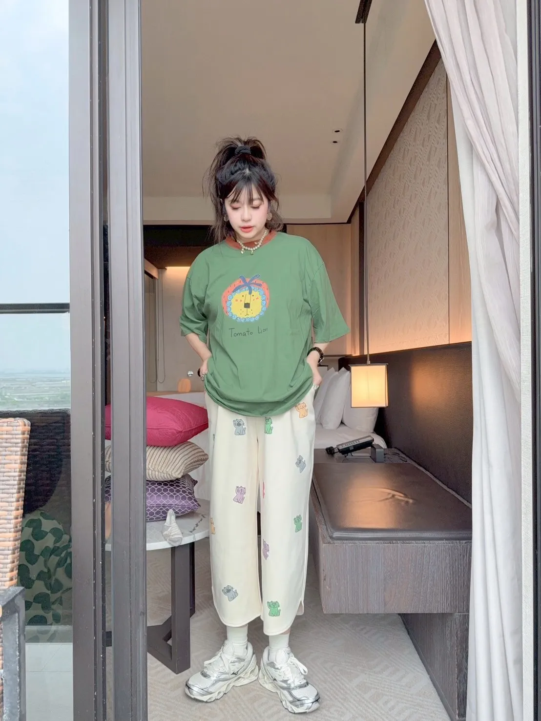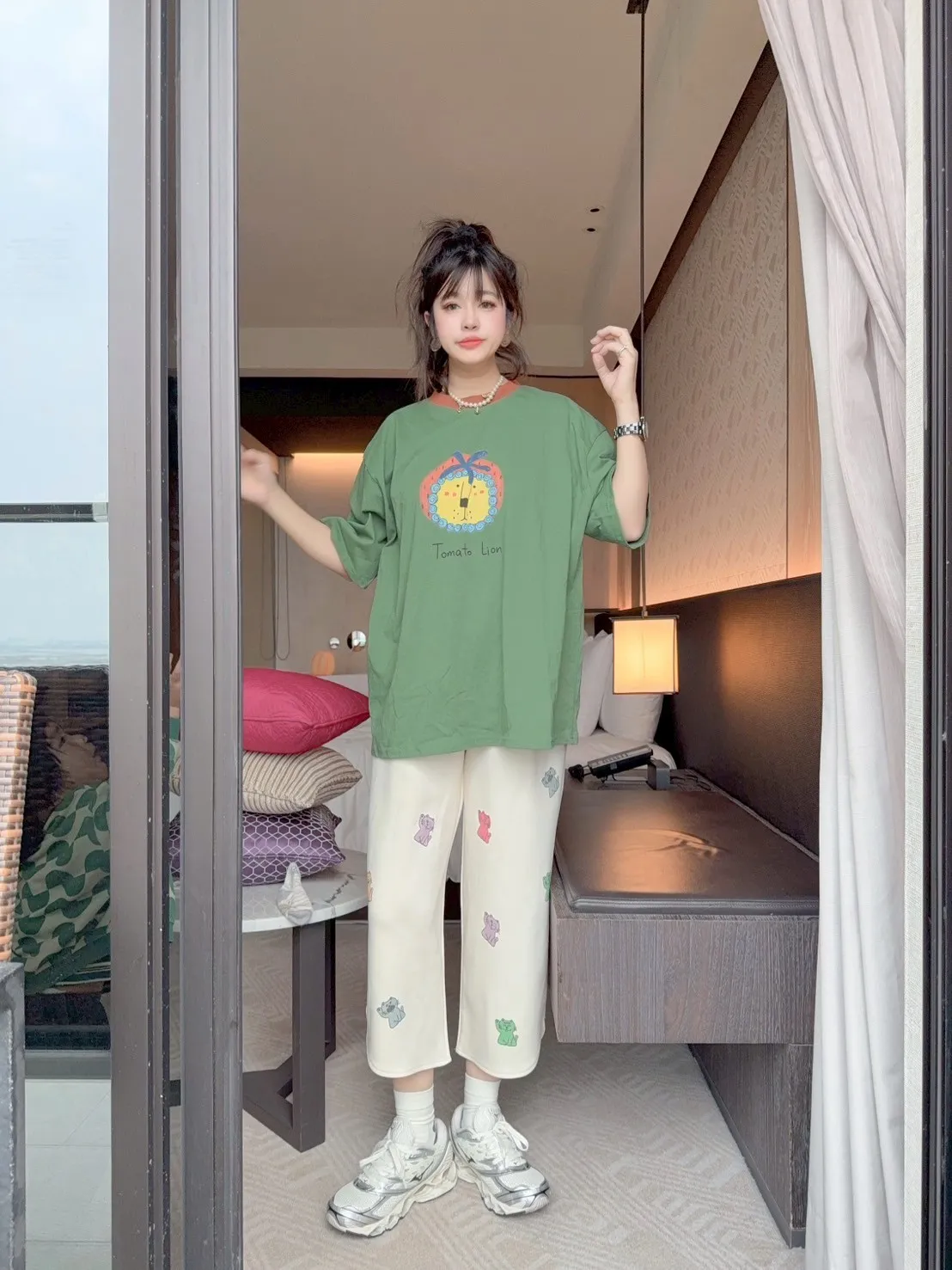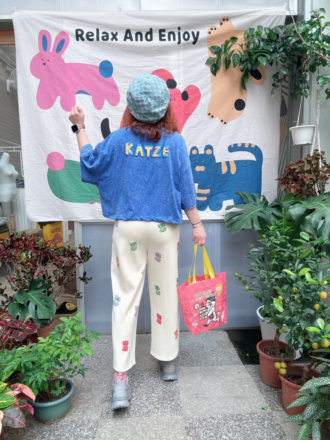 KATZE限量原創款-滿版招財小貓舒適太空棉褲 2色