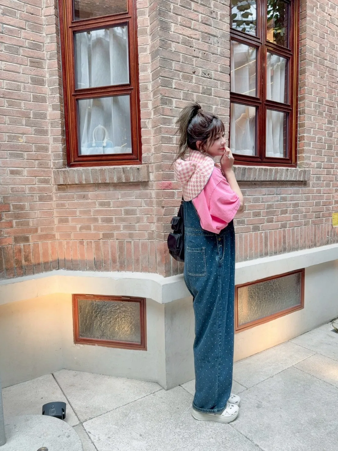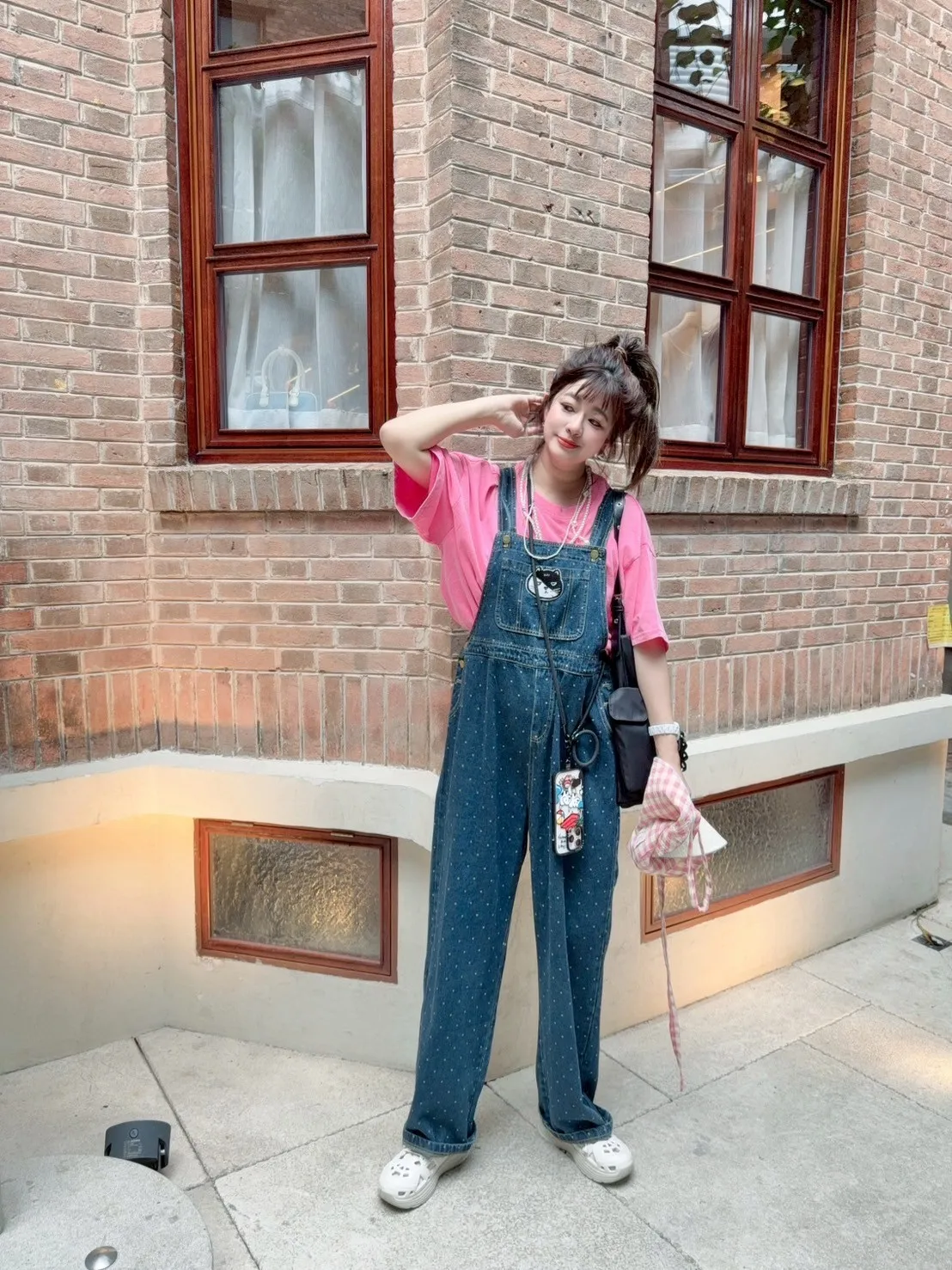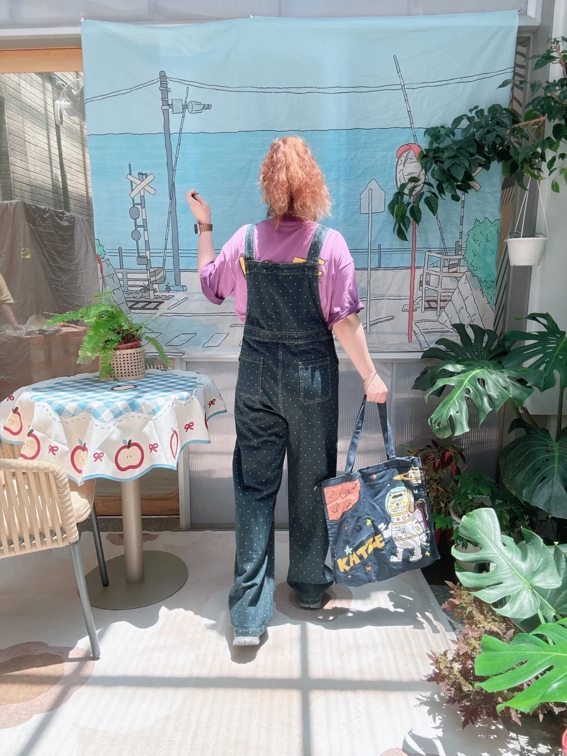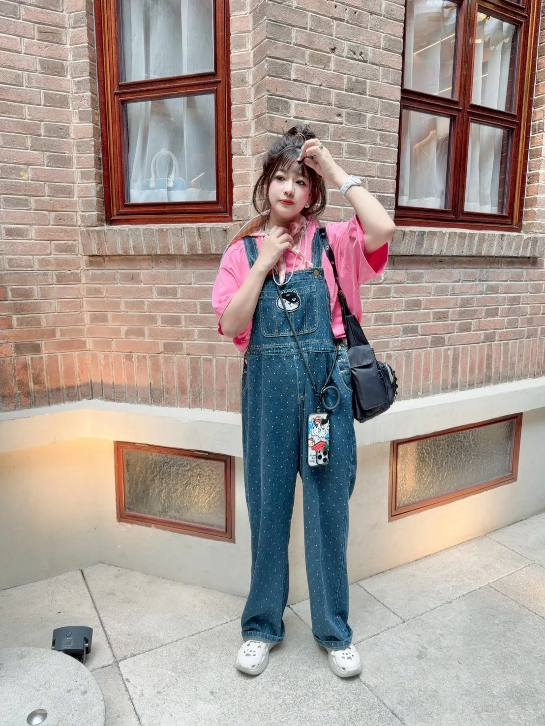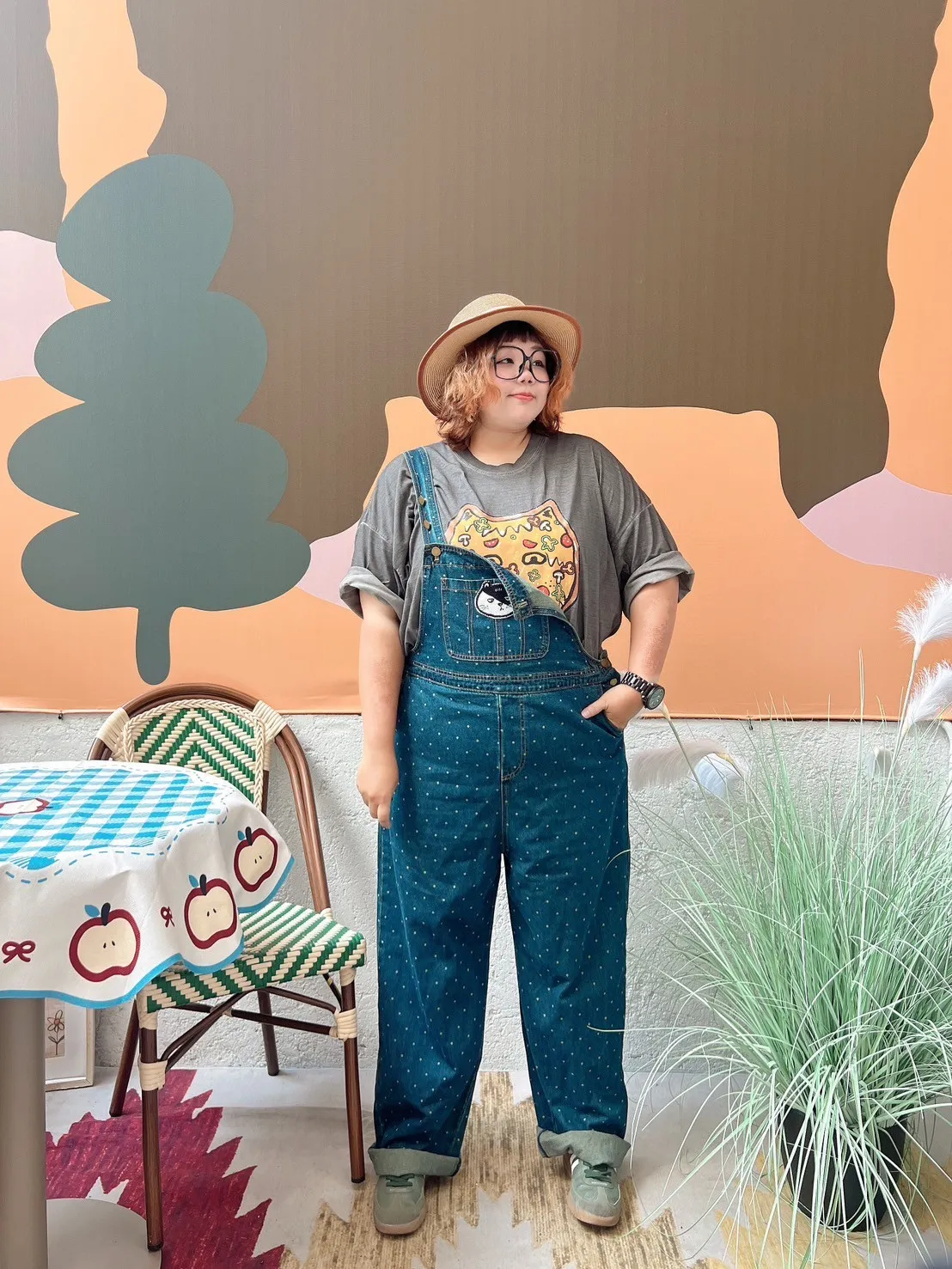 KATZE限量原創款-滿版點點刺繡肉包標牛仔吊帶褲