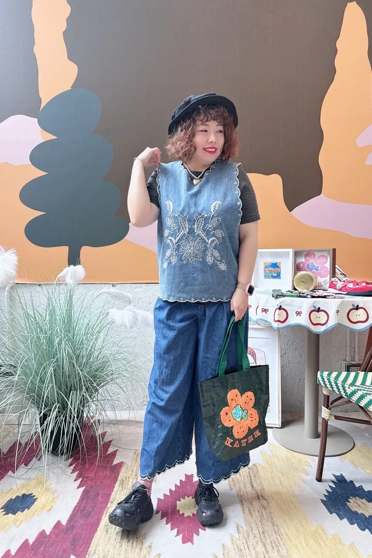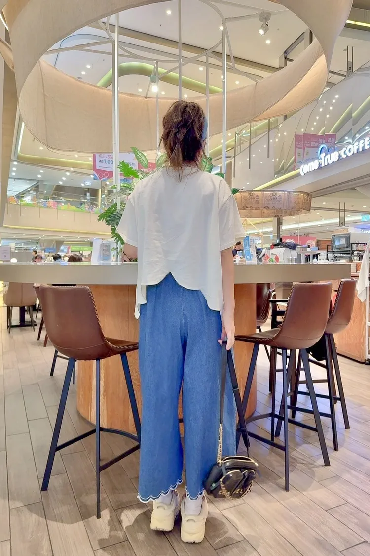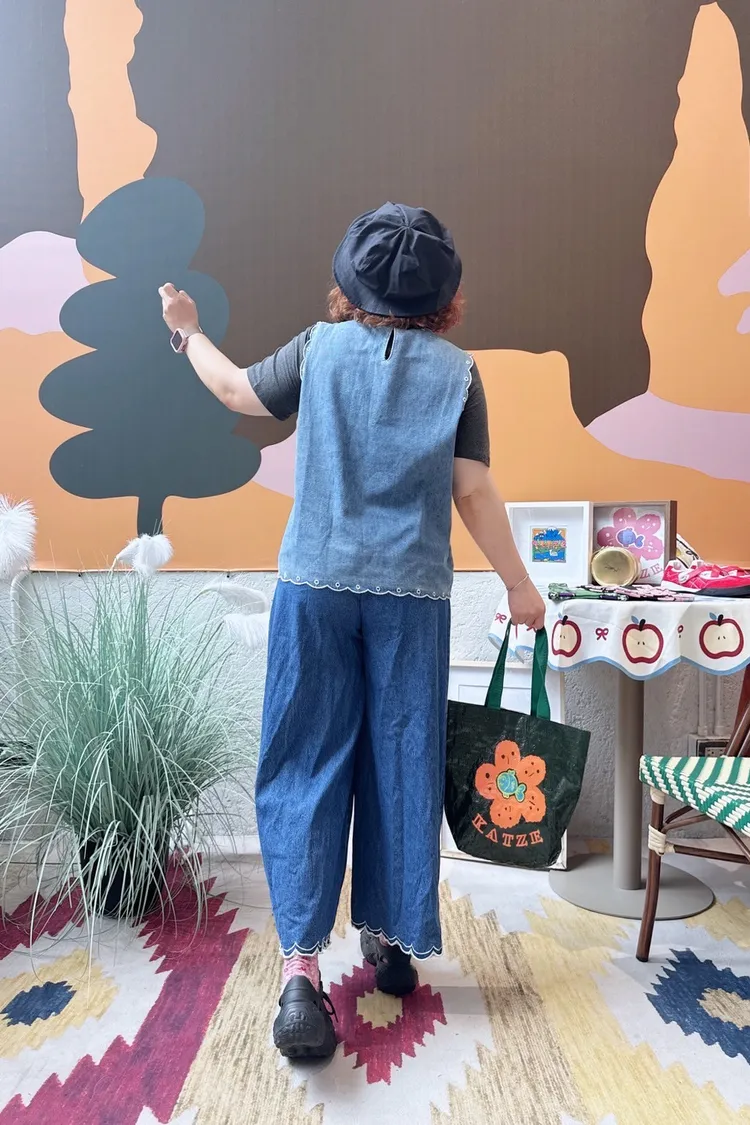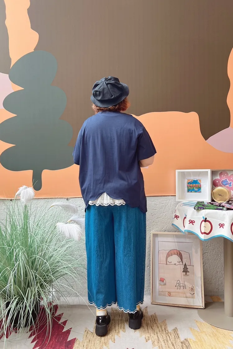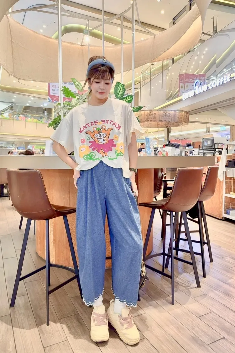 KATZE限量原創款-日系下擺花瓣鬆緊褲頭牛仔長褲