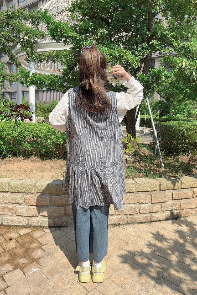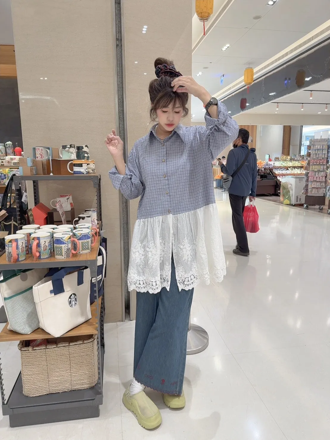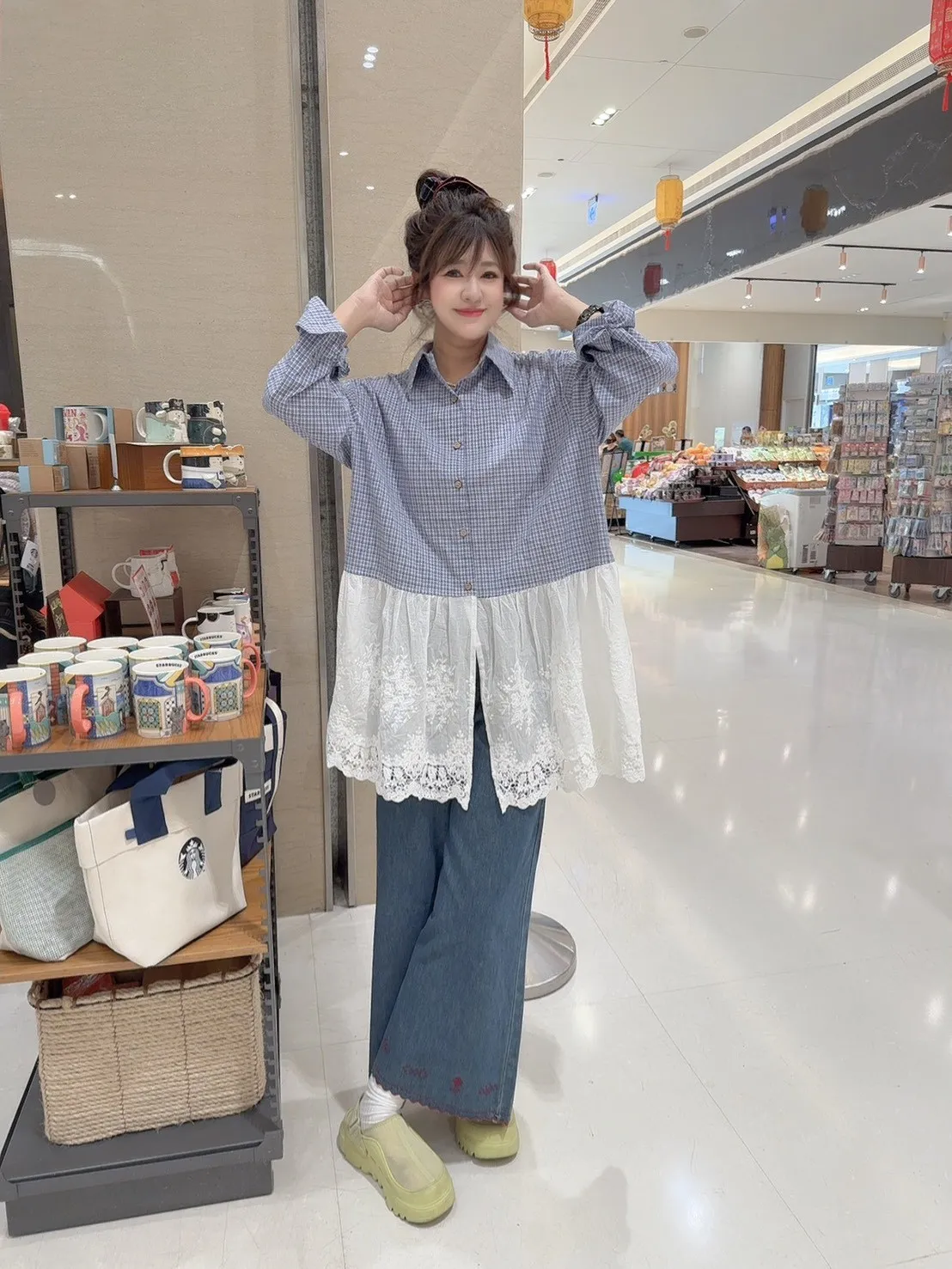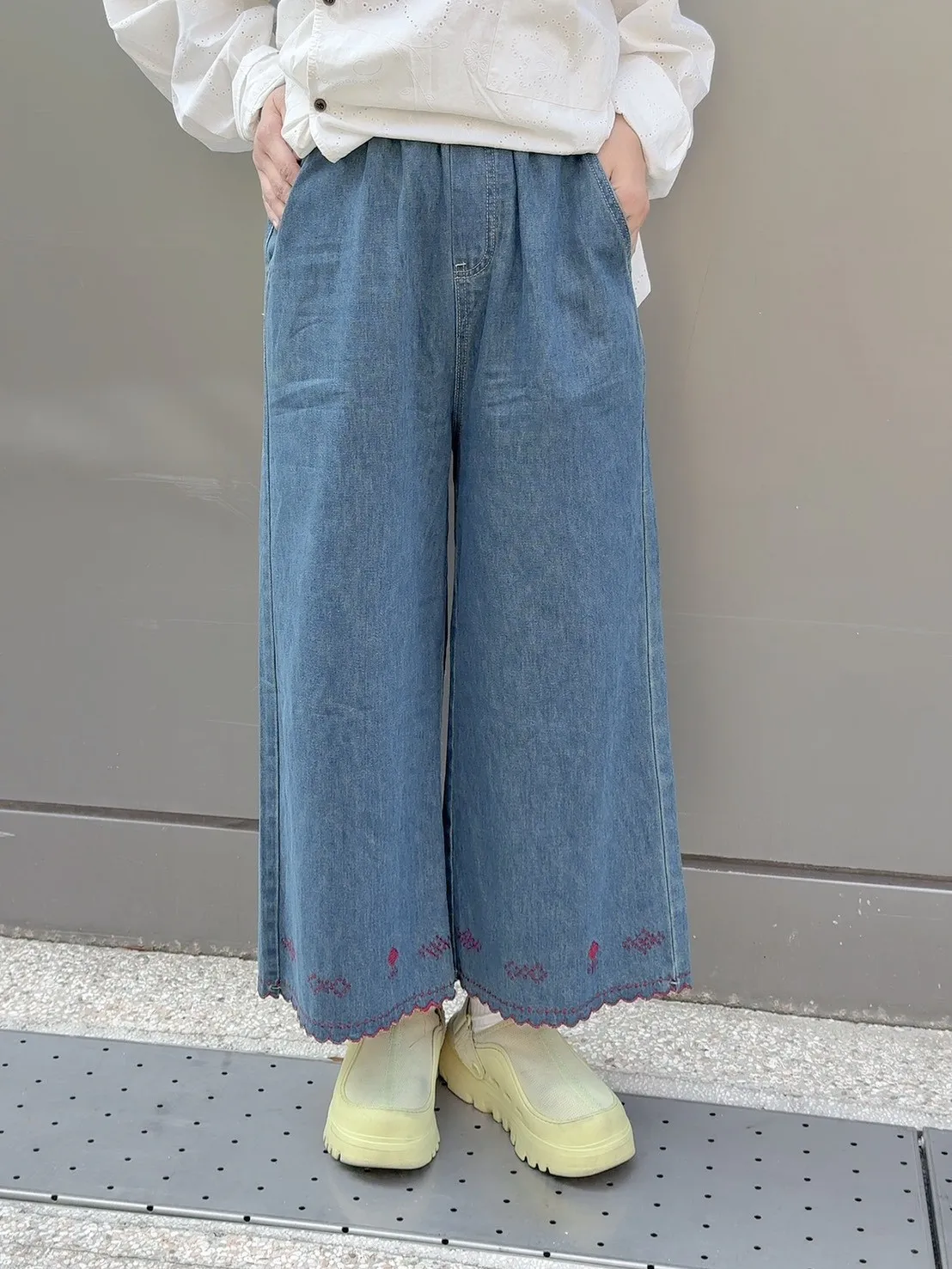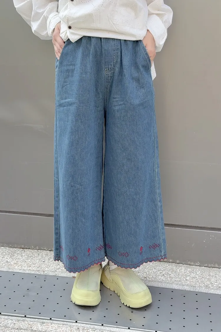 仿舊刺繡菱格紋花邊褲腳牛仔褲