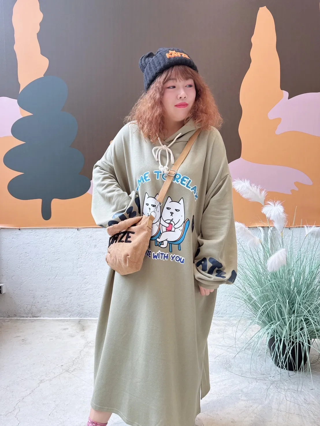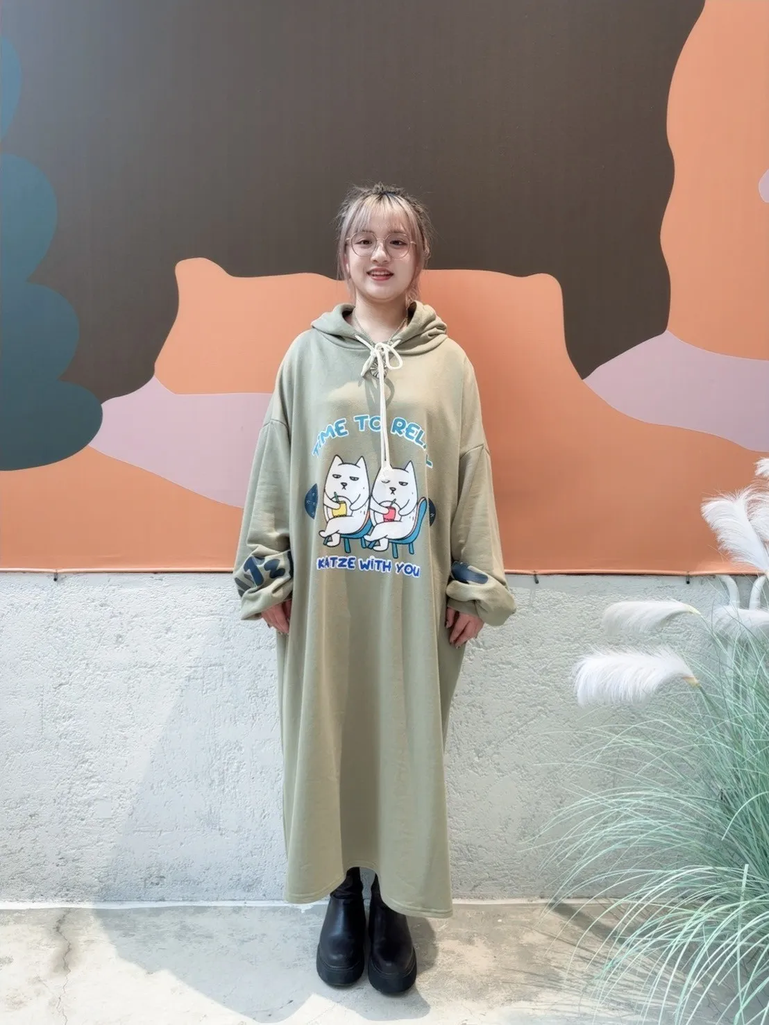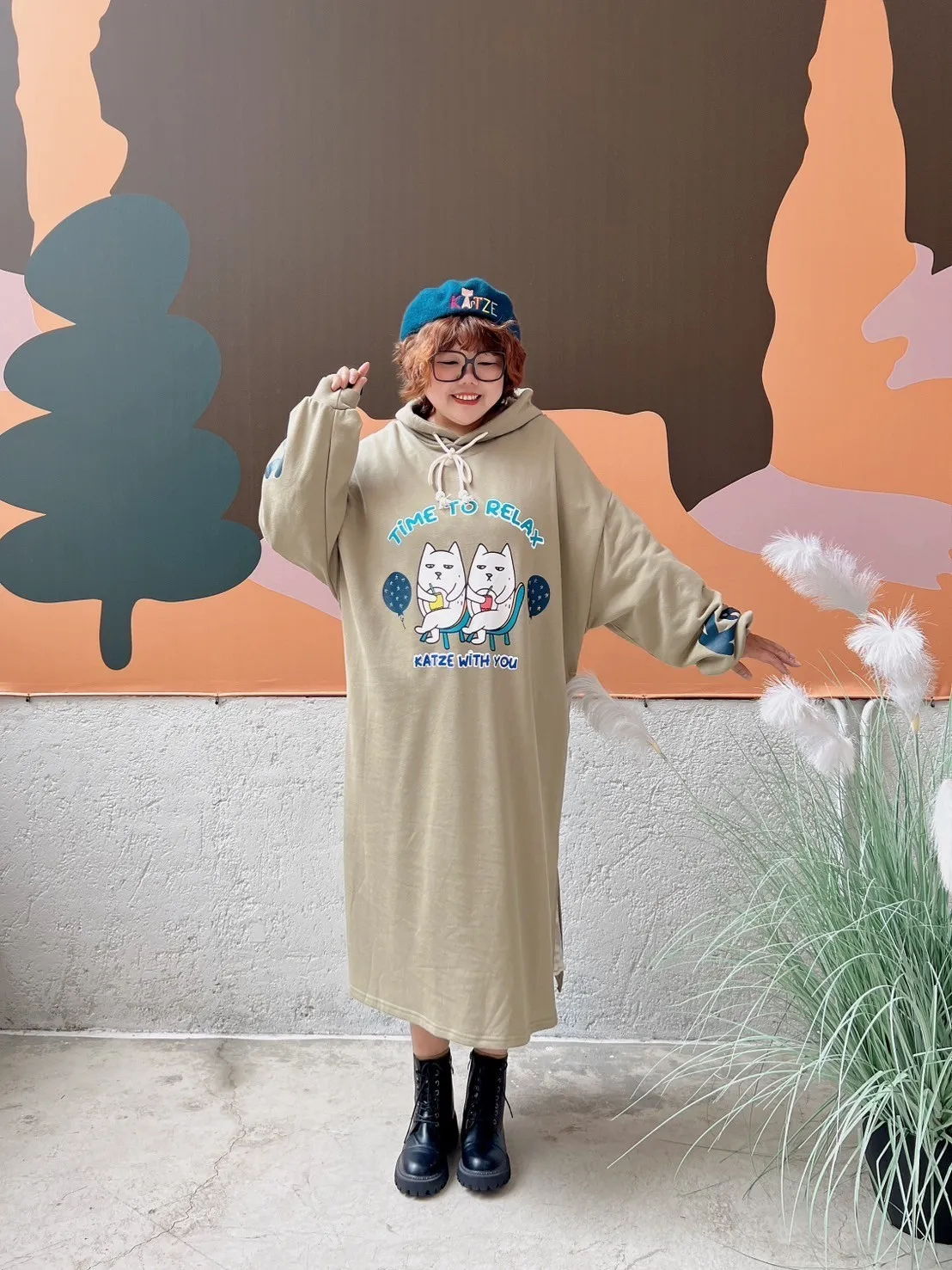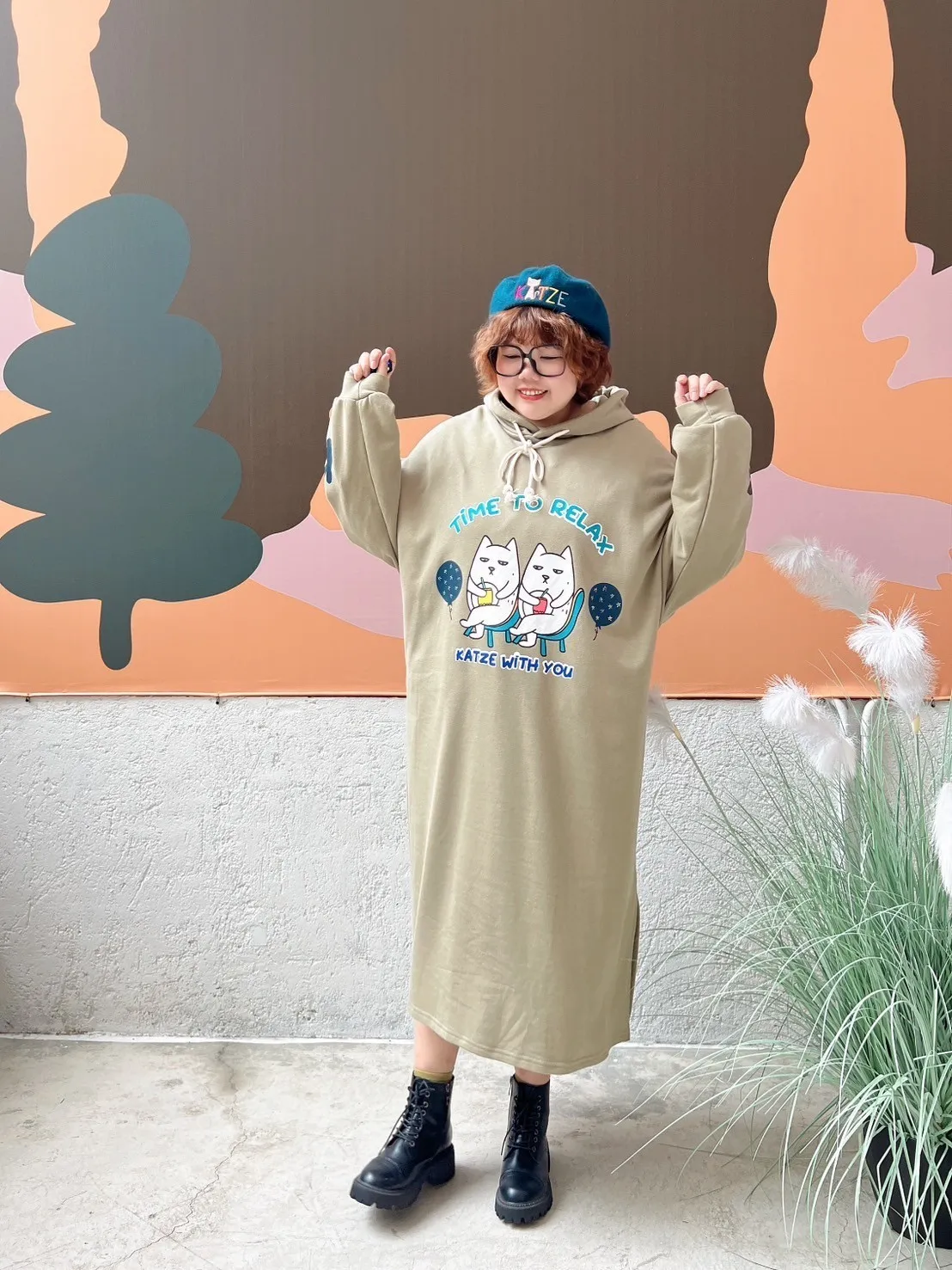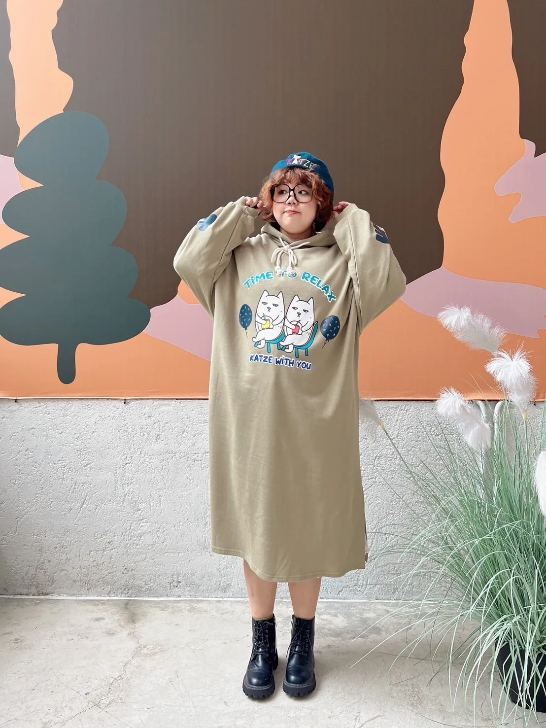 KATZE限量原創款-TIME TO RELAX印刷一起貓舒適連帽洋裝 2色