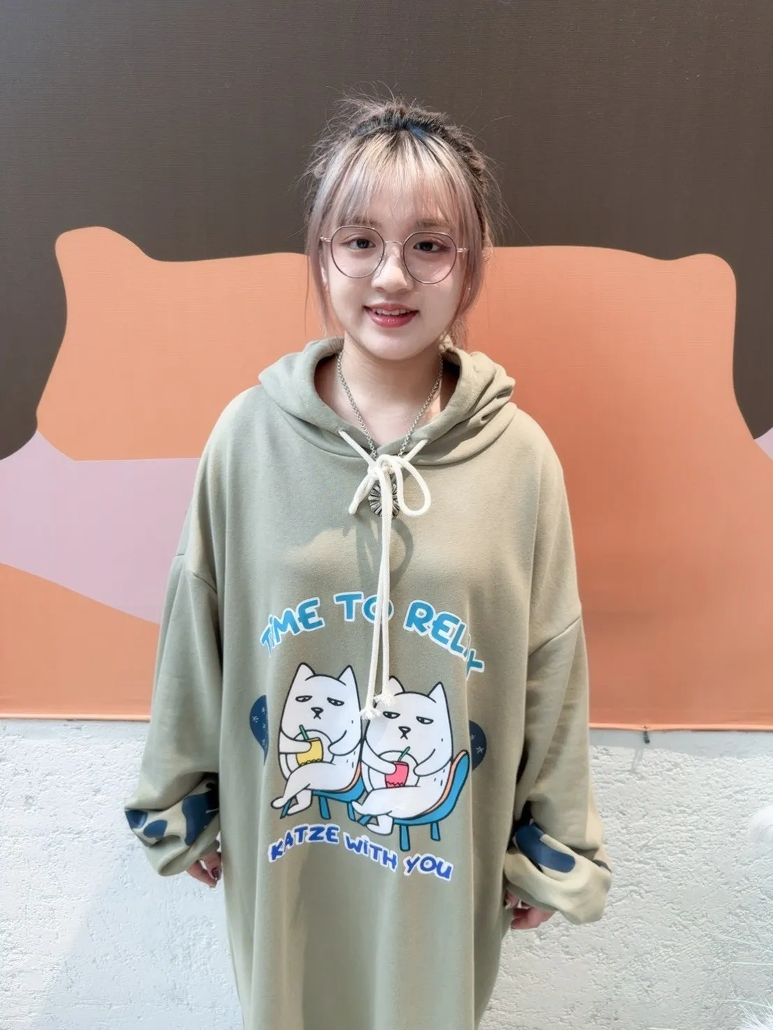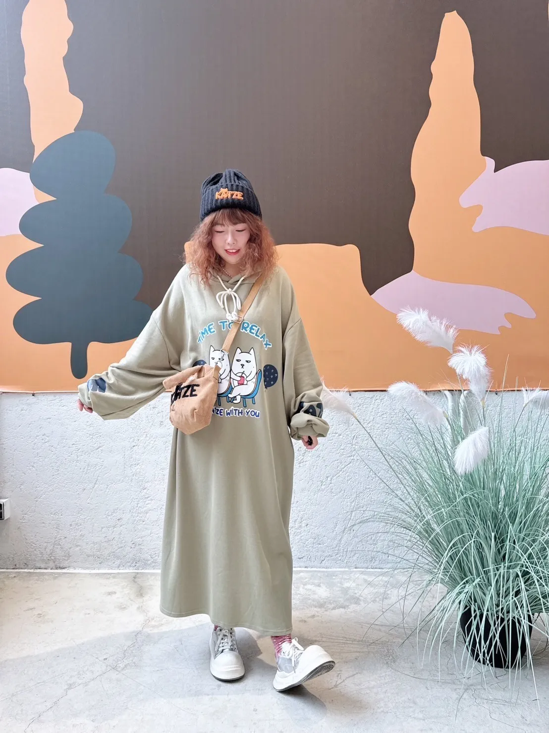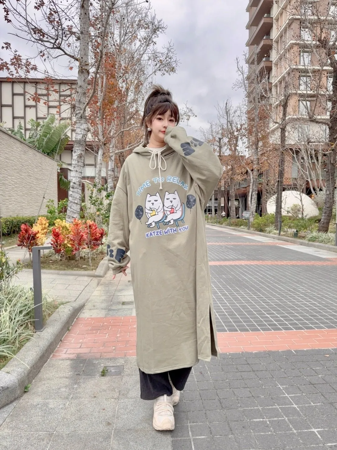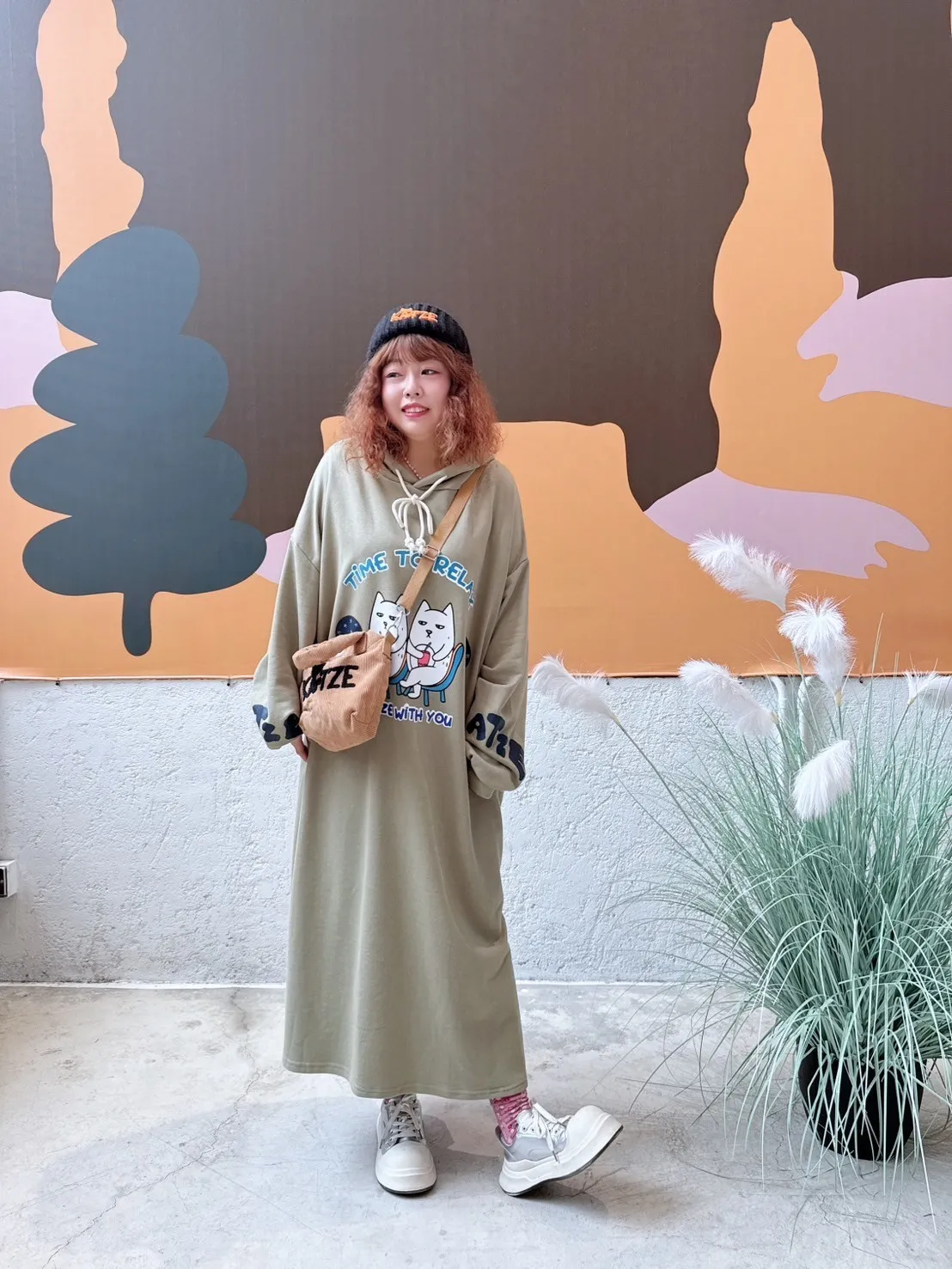 KATZE限量原創款-TIME TO RELAX印刷一起貓舒適連帽洋裝 2色