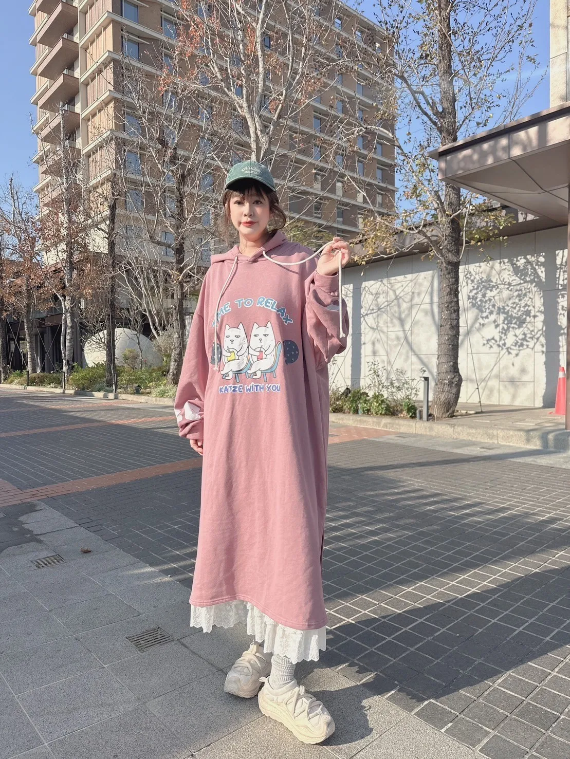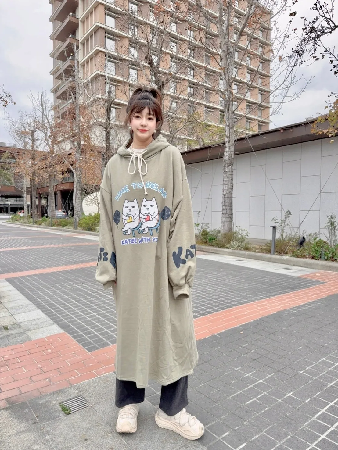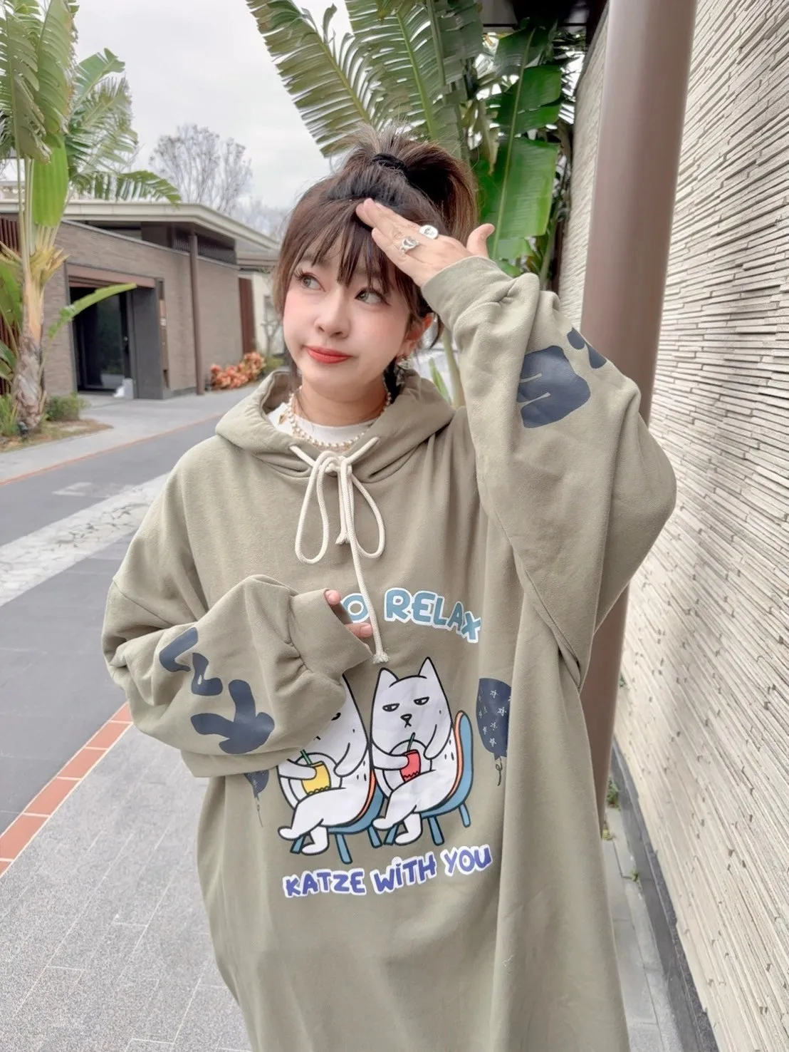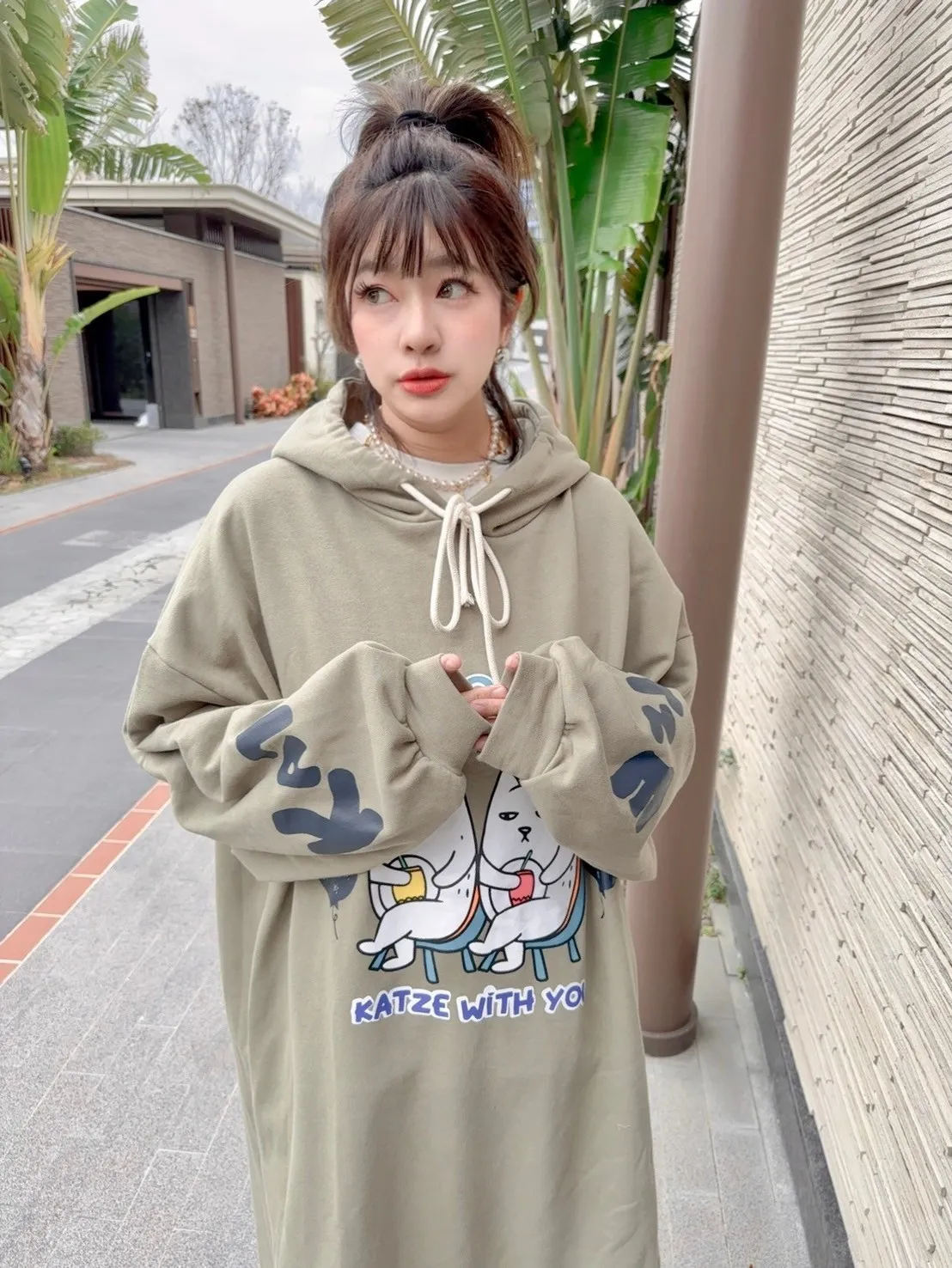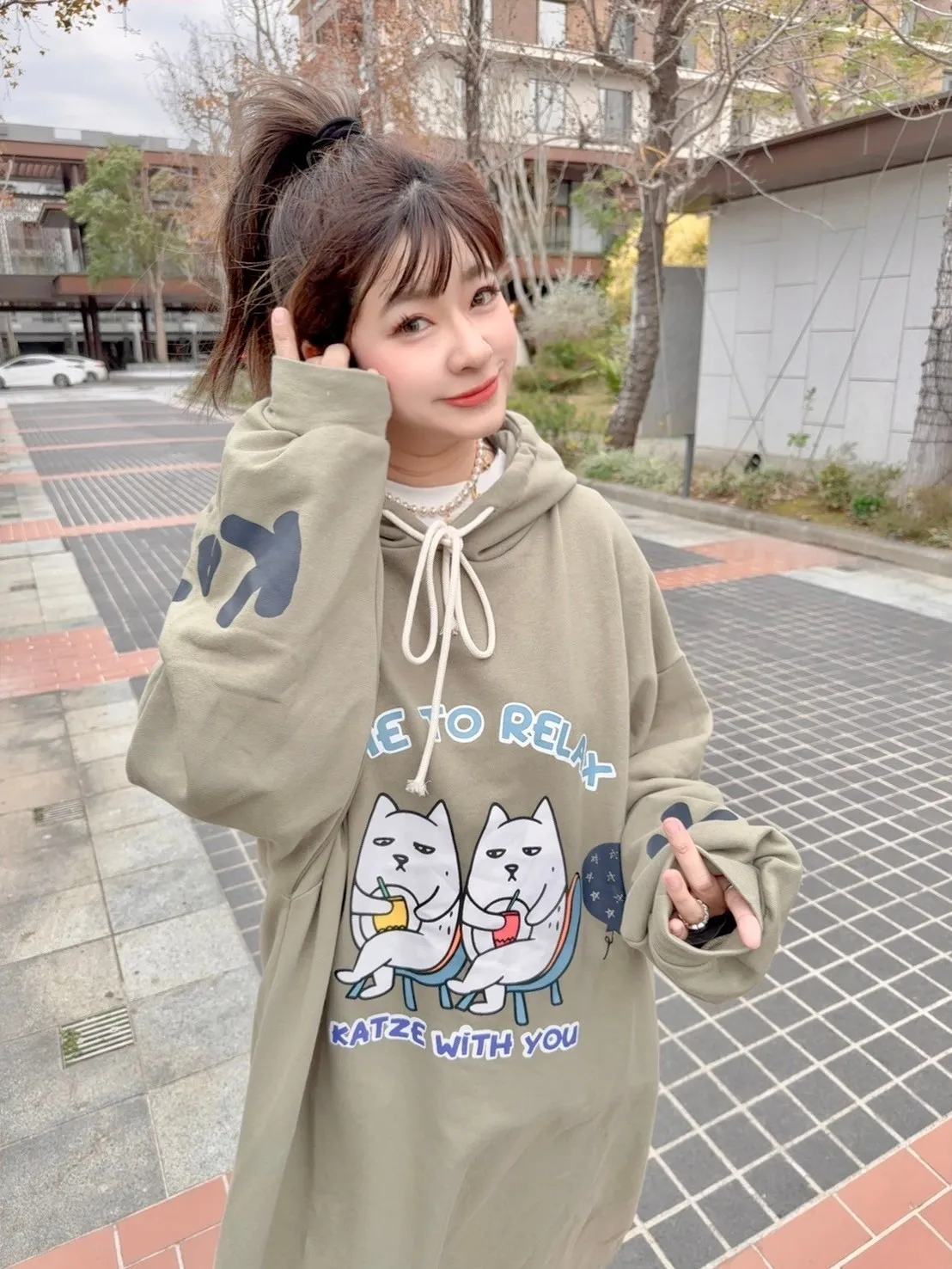 KATZE限量原創款-TIME TO RELAX印刷一起貓舒適連帽洋裝 2色