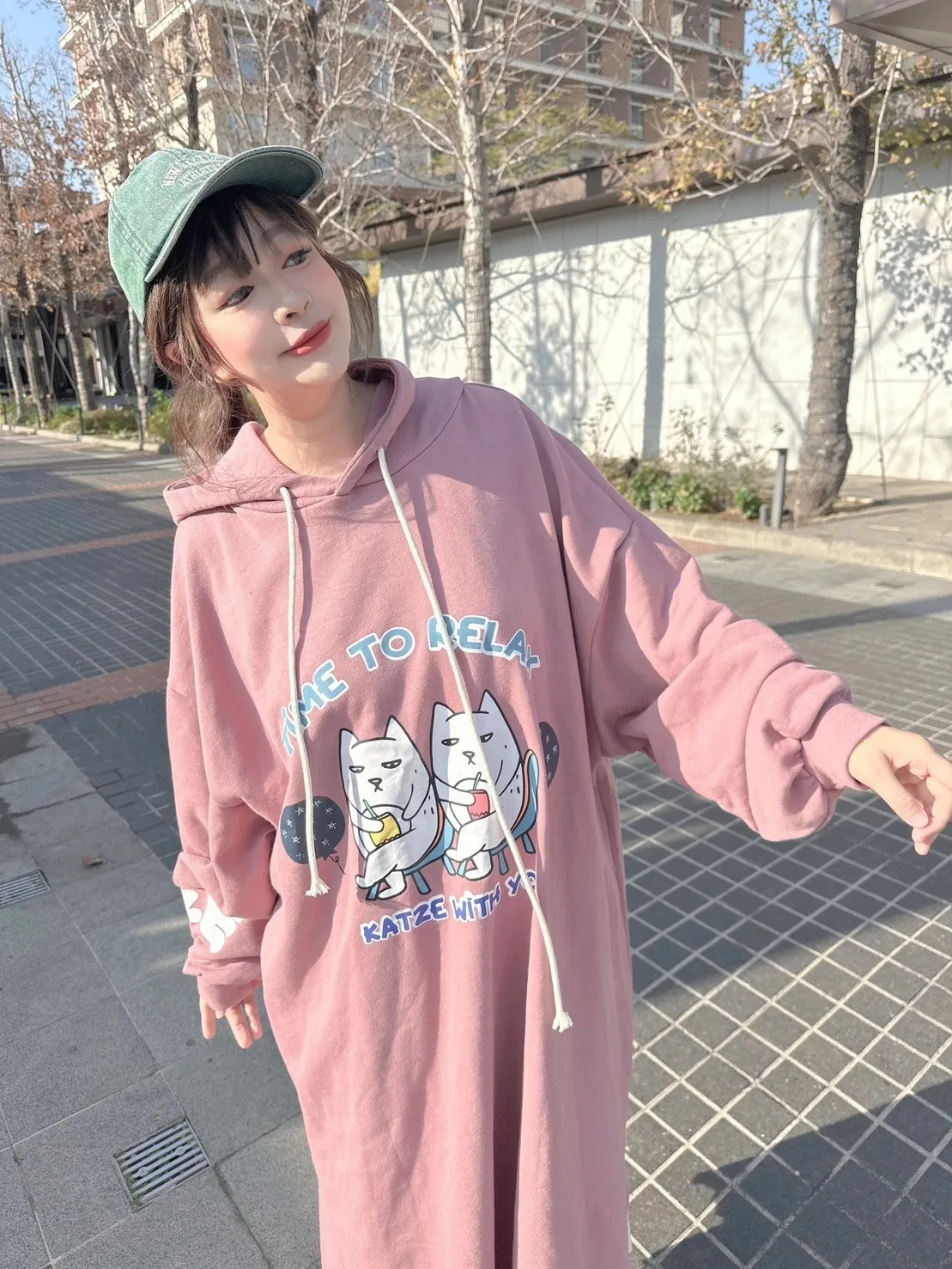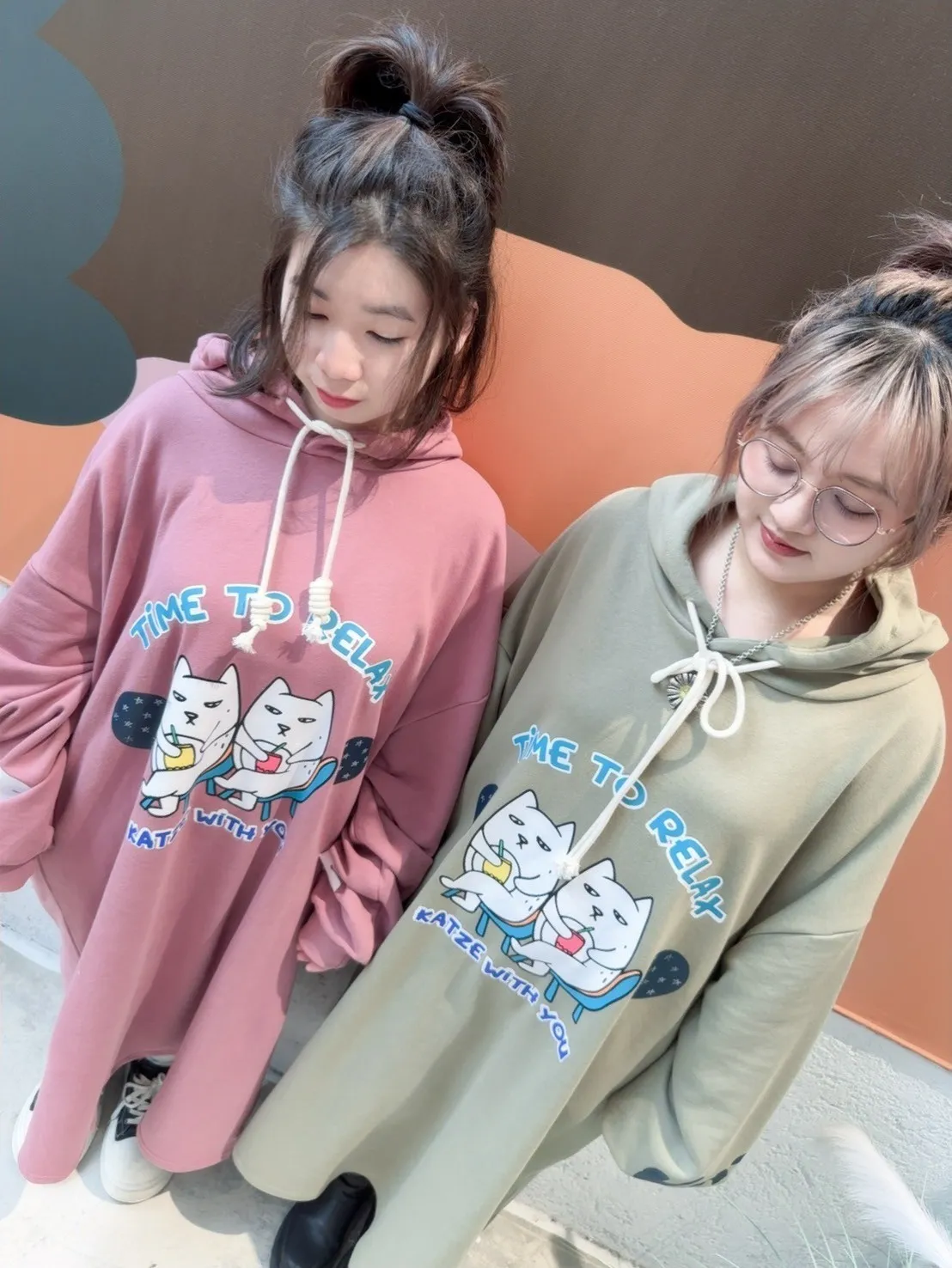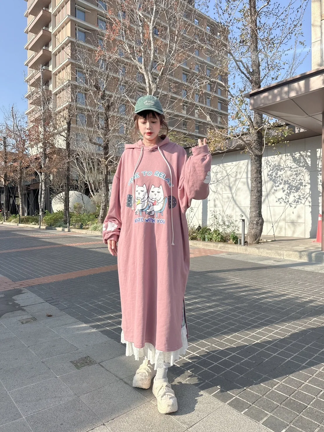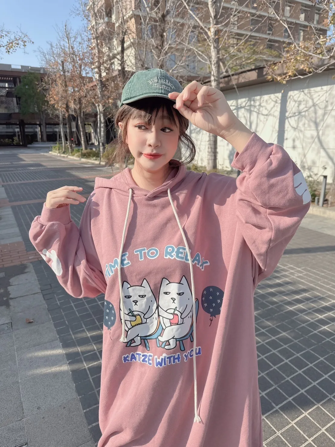 KATZE限量原創款-TIME TO RELAX印刷一起貓舒適連帽洋裝 2色
