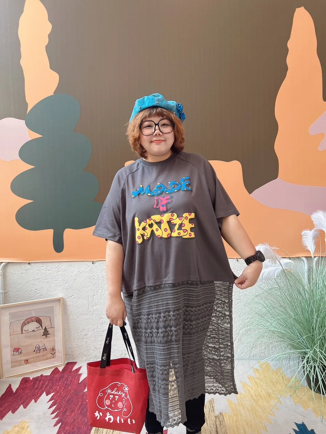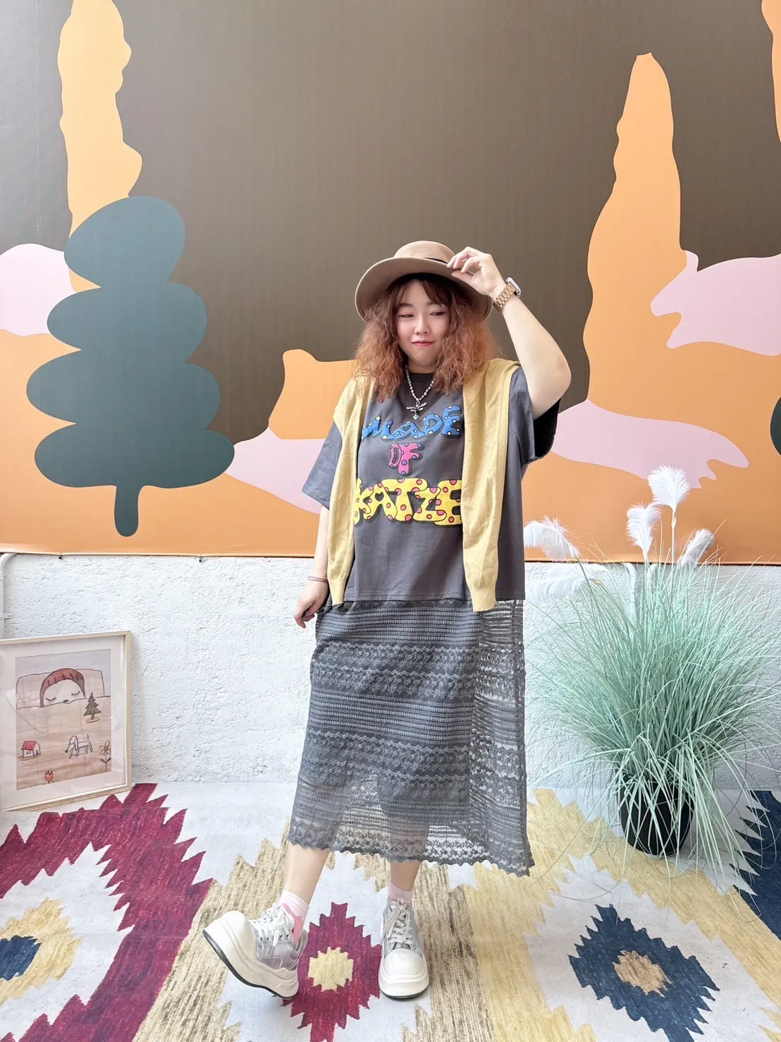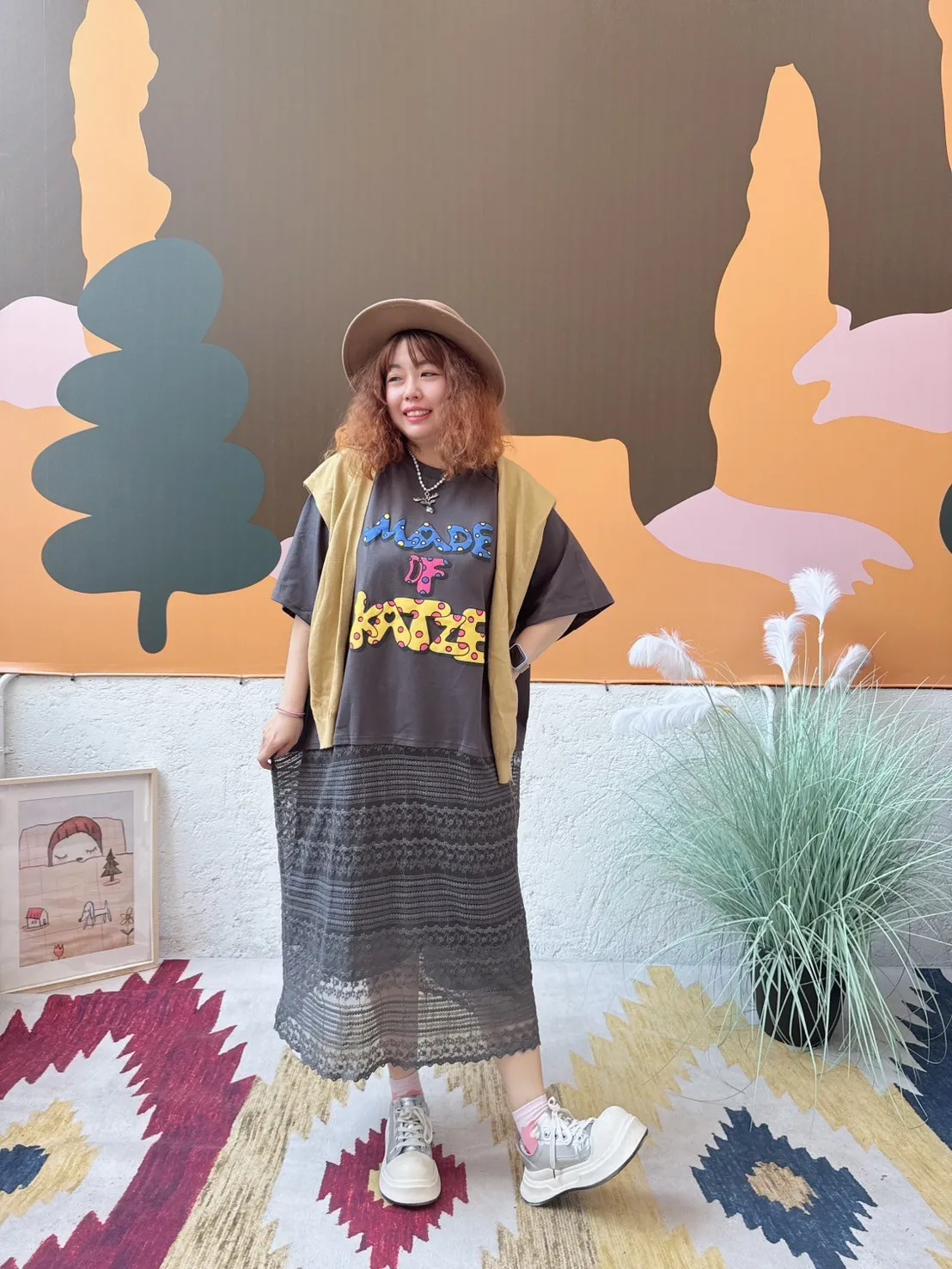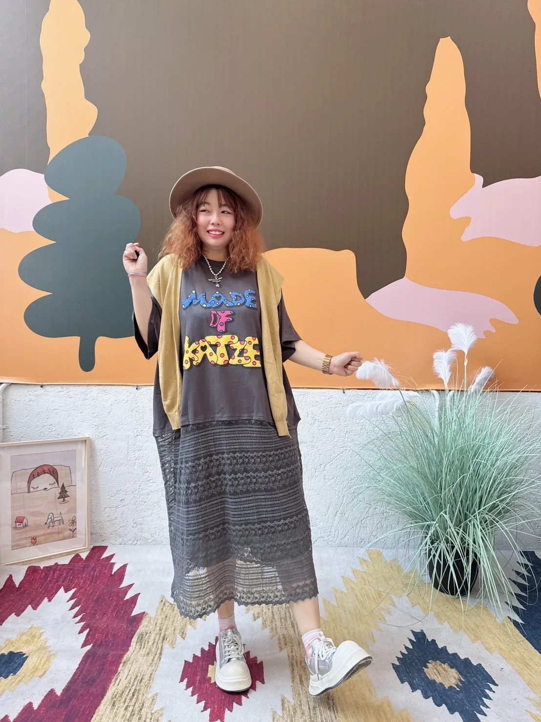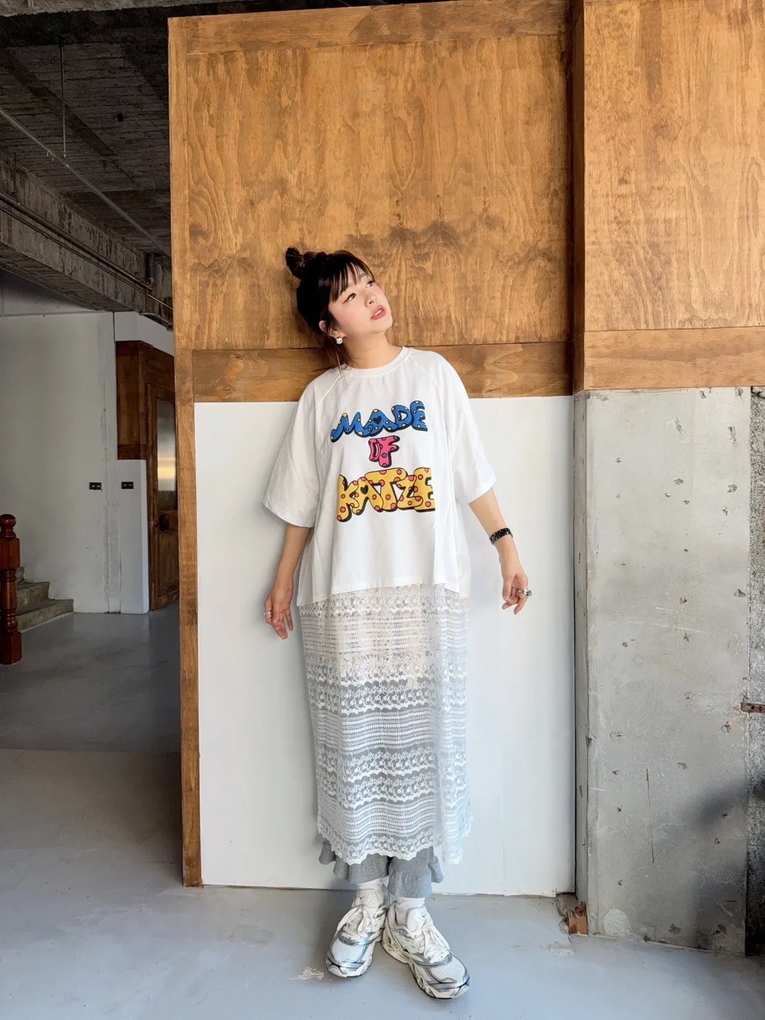 KATZE限量原創款-MADE OF KATZE英字印刷拼接蕾絲洋裝 2色