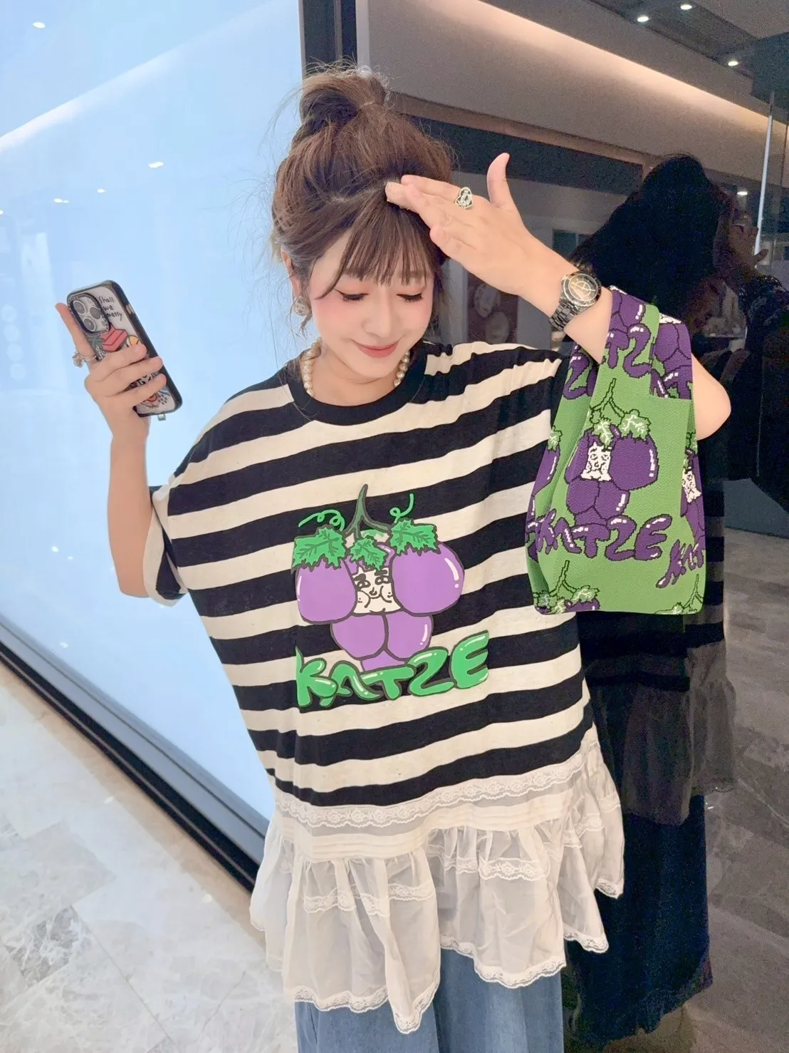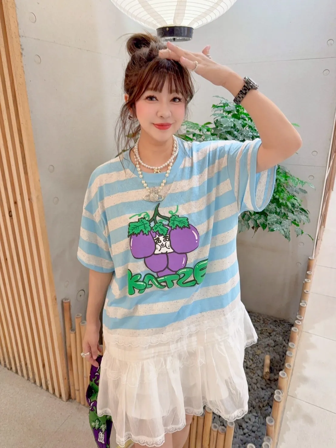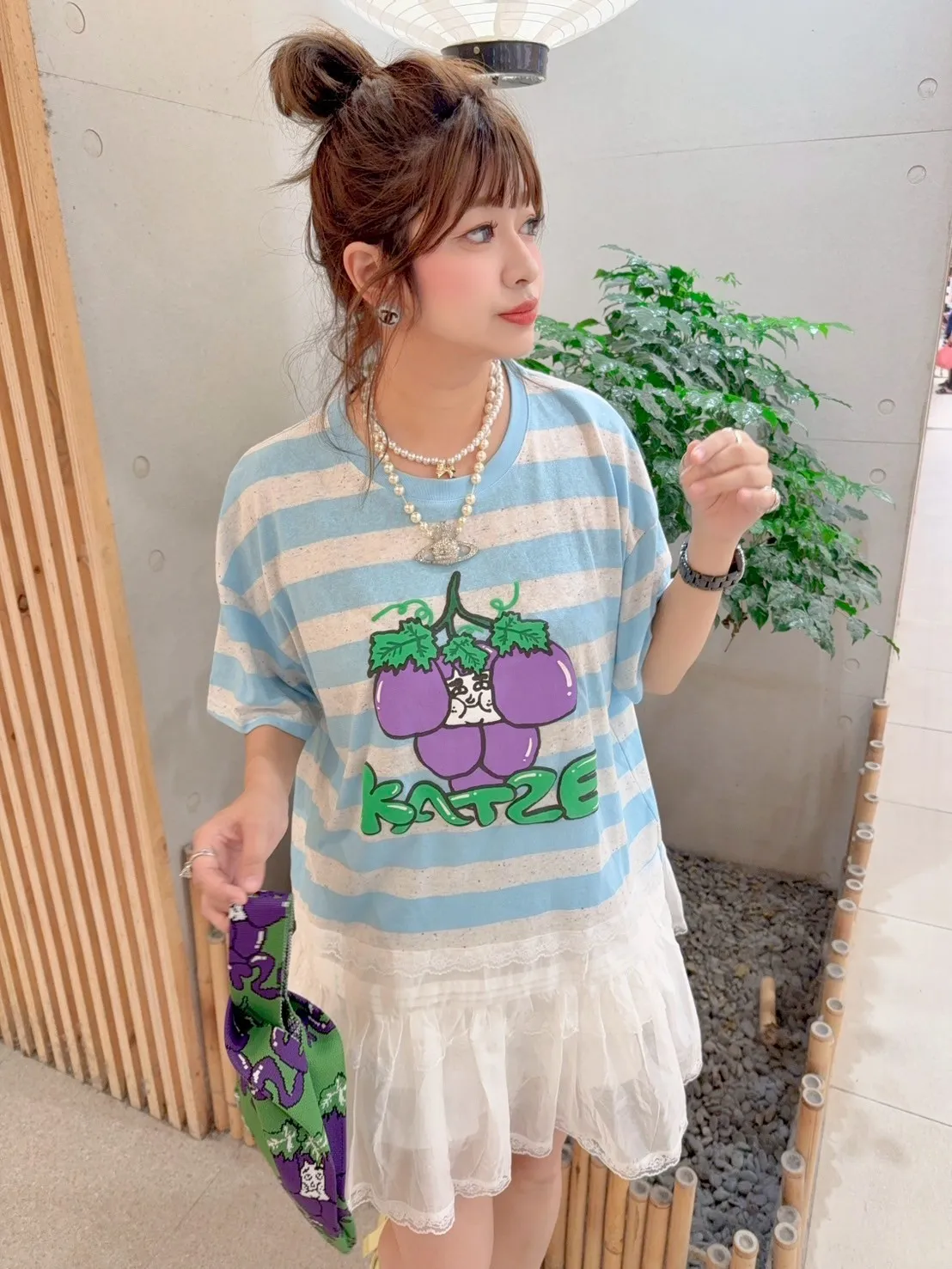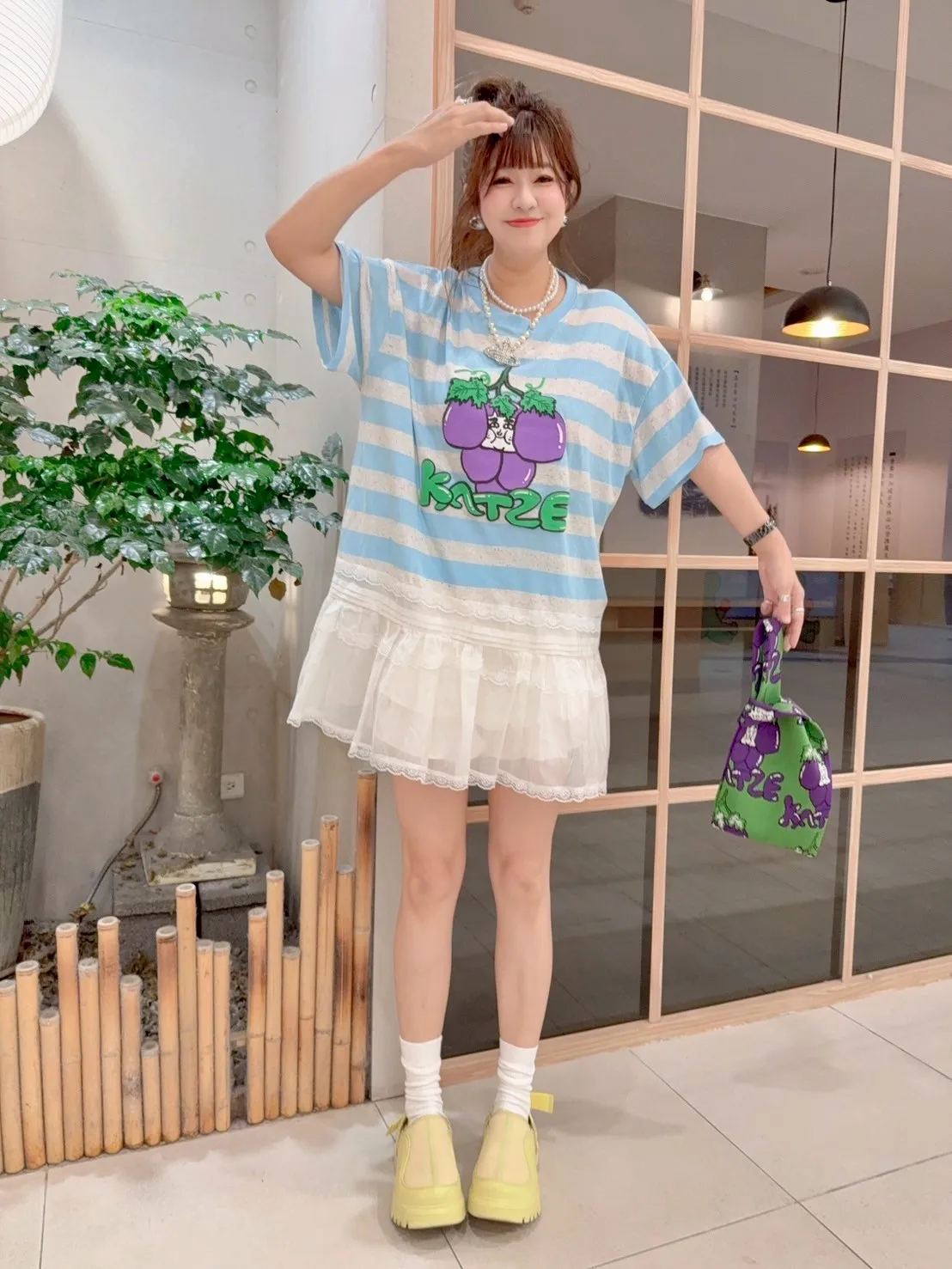 KATZE限量原創款-肉妹葡萄橫條拼接蕾絲短洋 2色