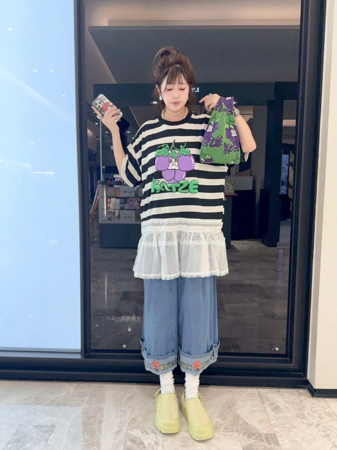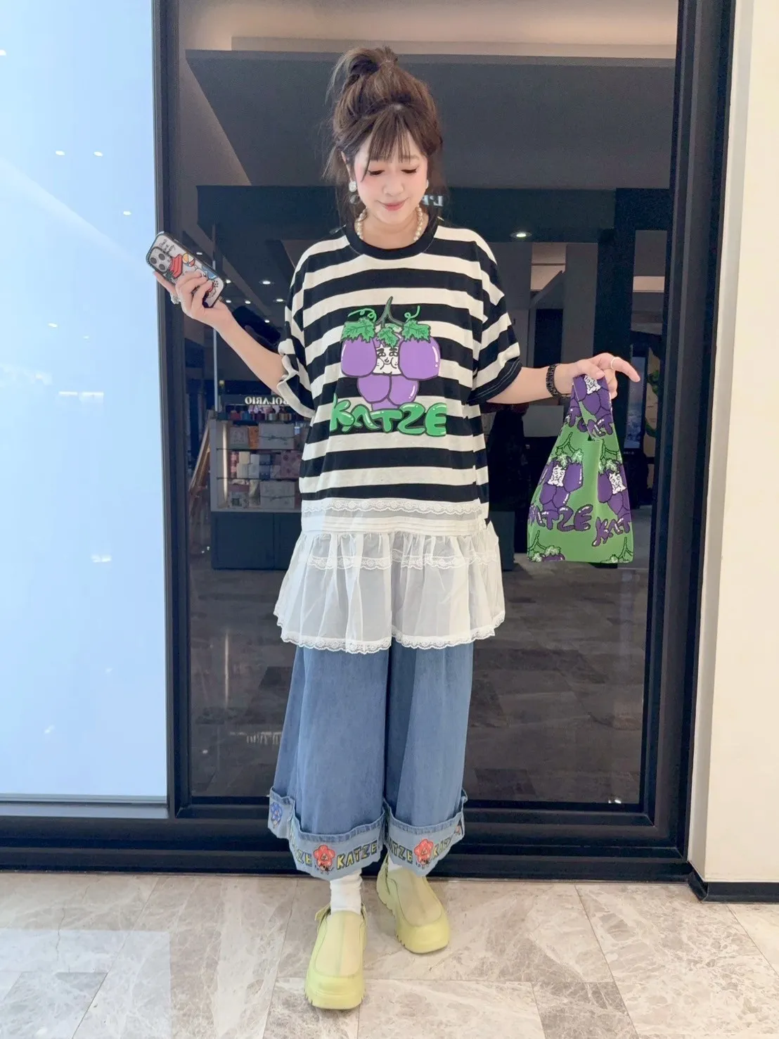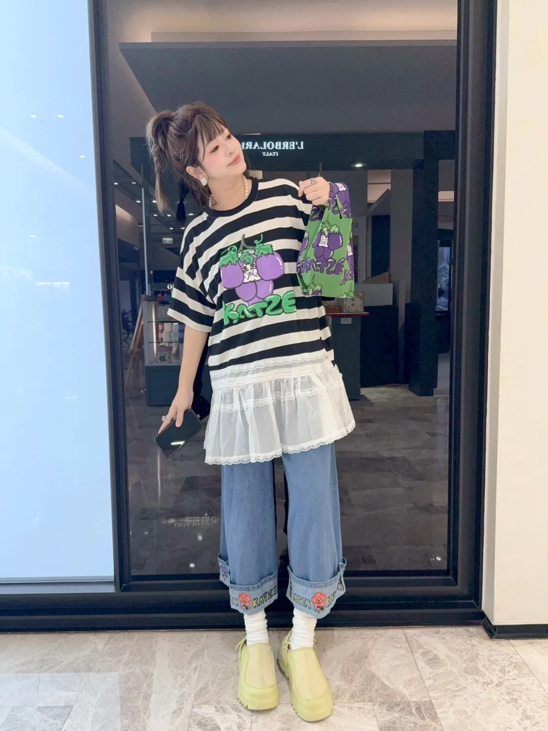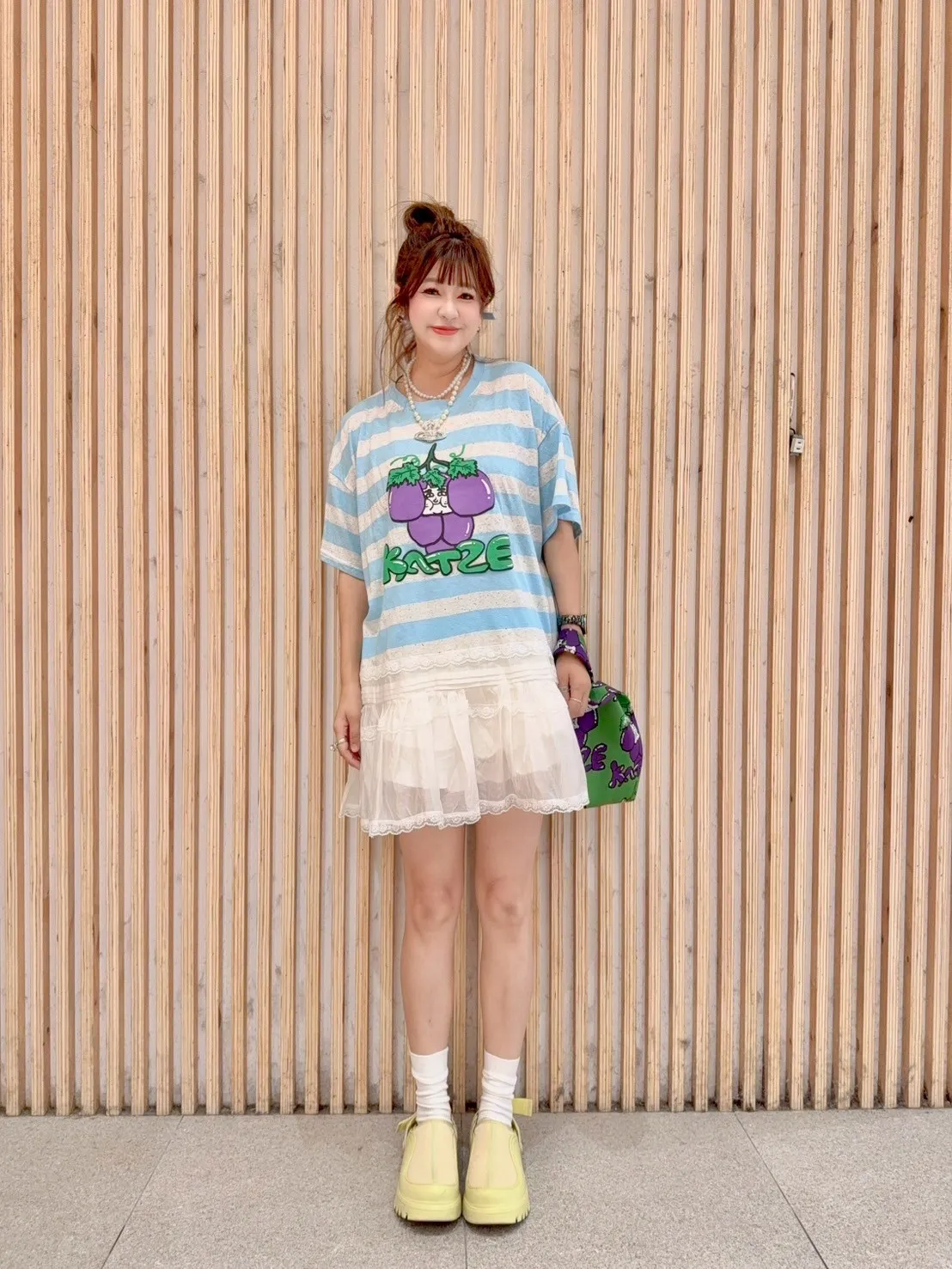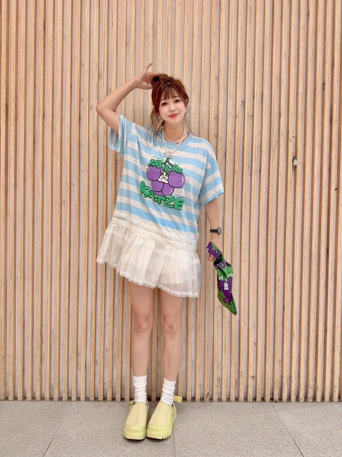 KATZE限量原創款-肉妹葡萄橫條拼接蕾絲短洋 2色