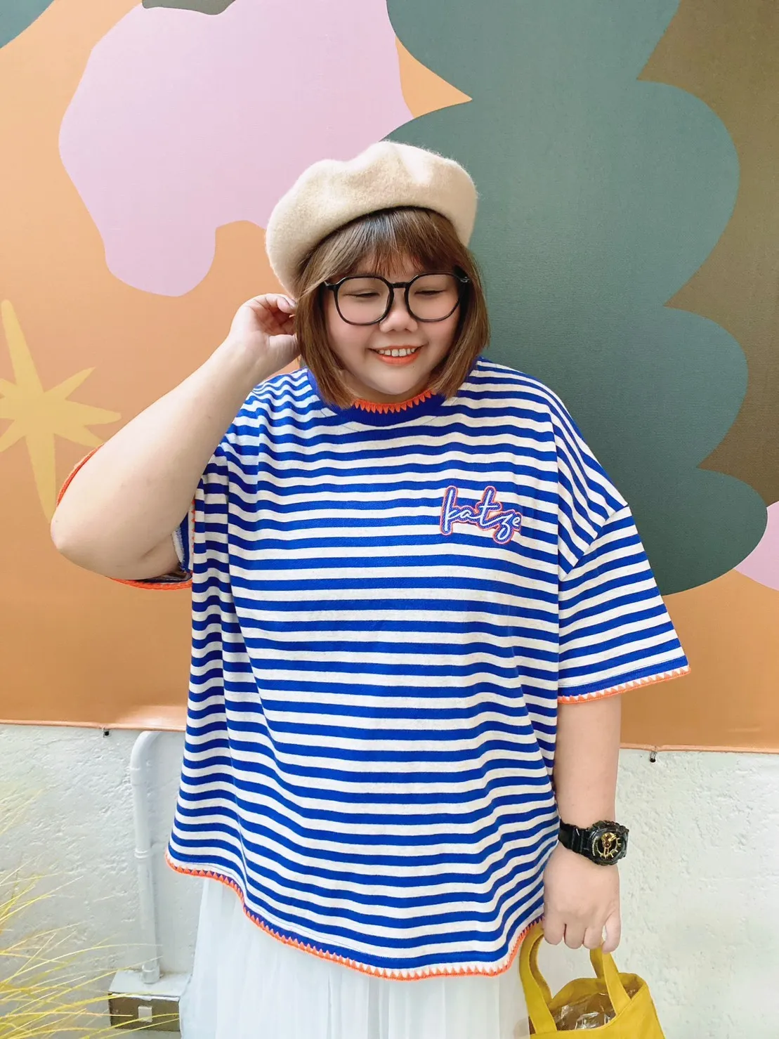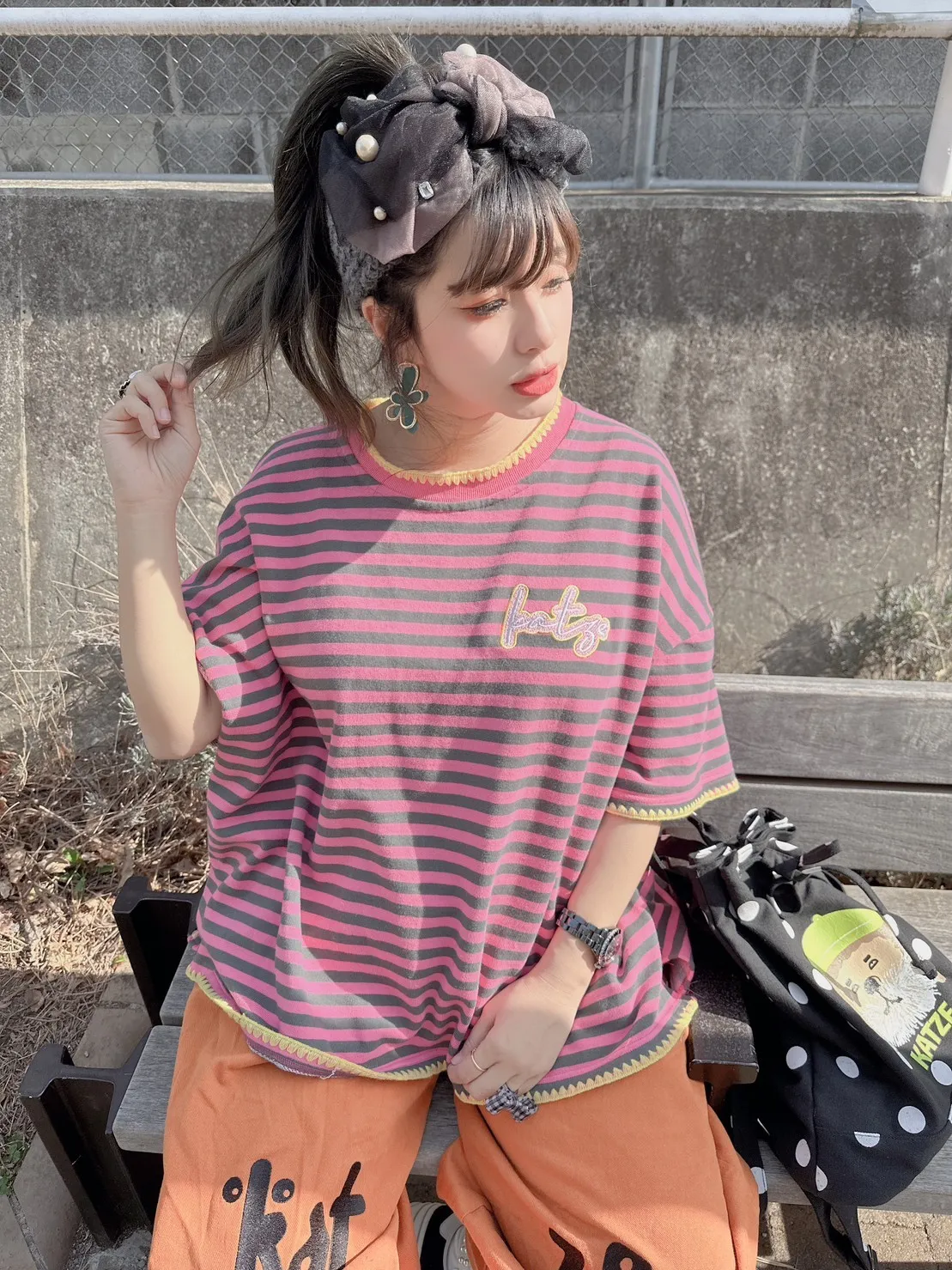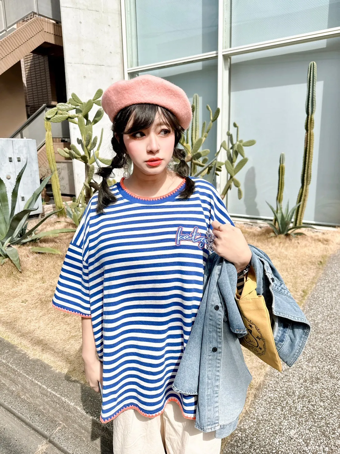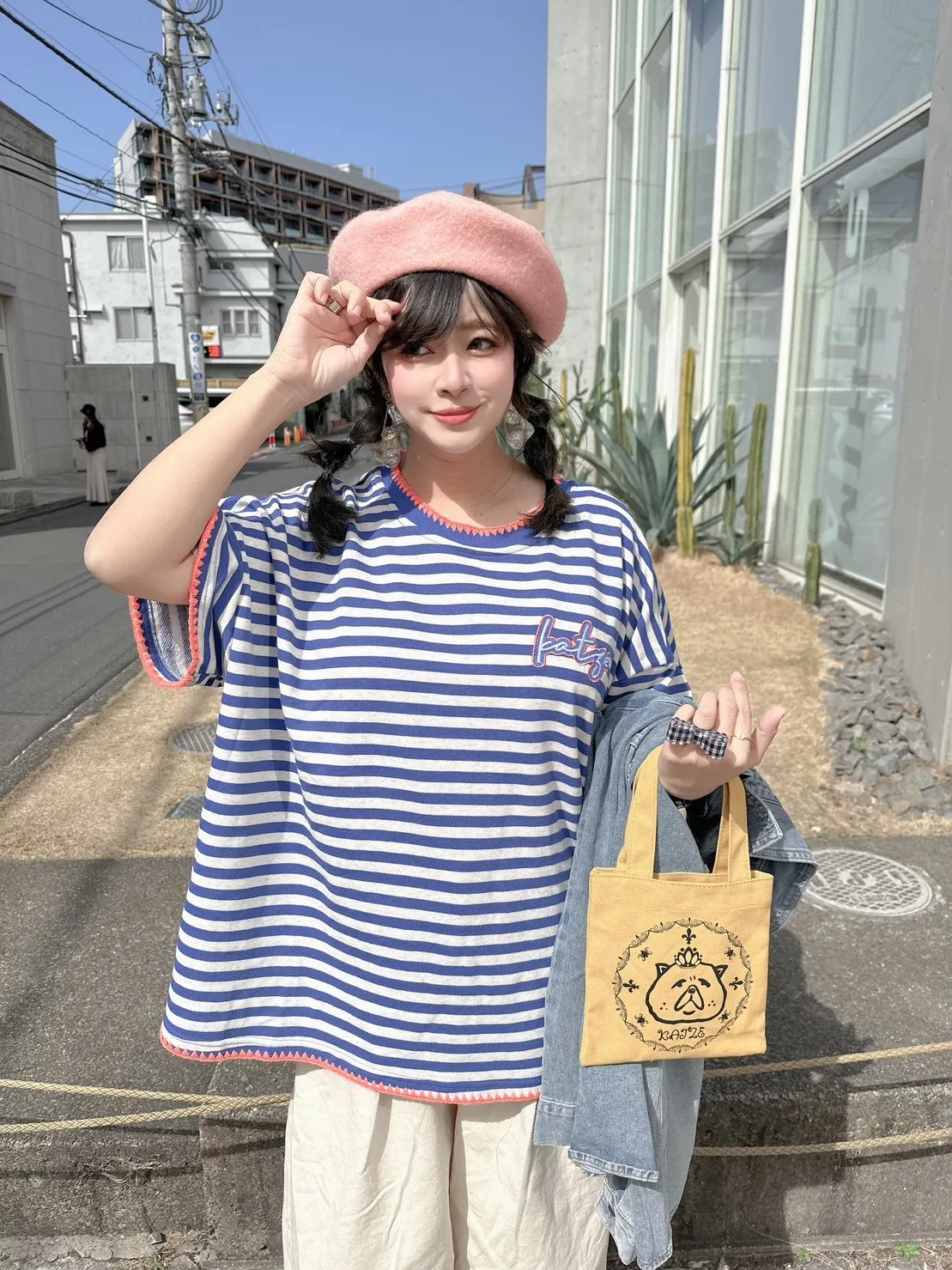 KATZE限量原創款-春夏必備撞色刺繡LOGO橫條上衣 2色