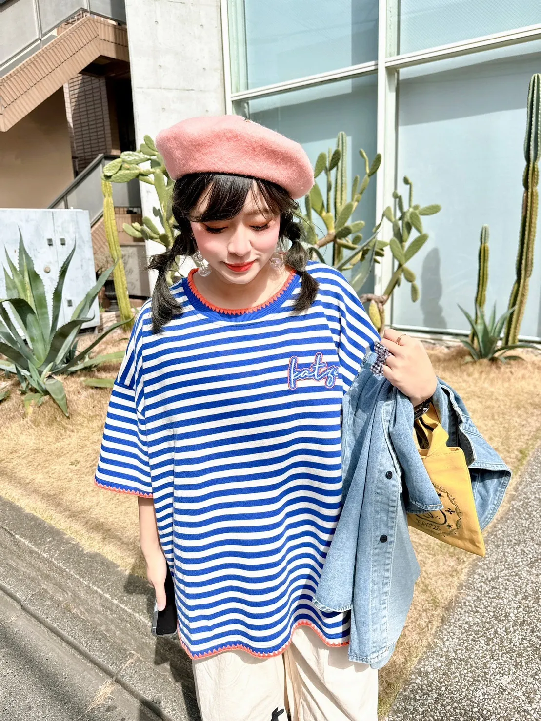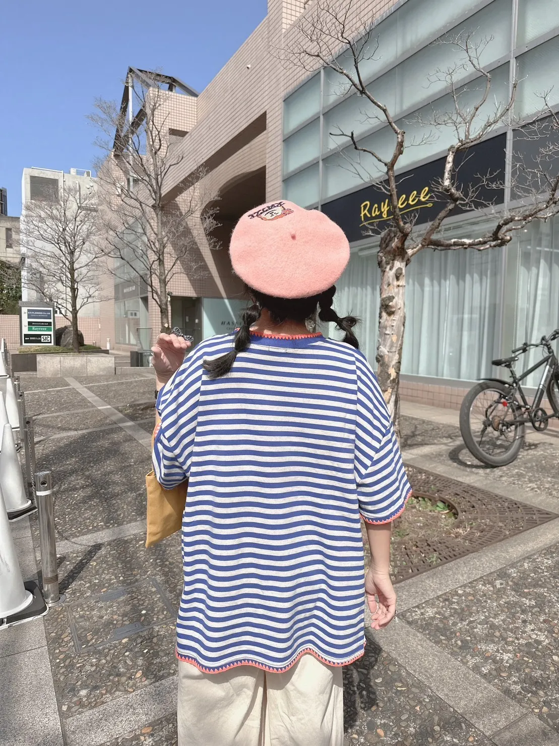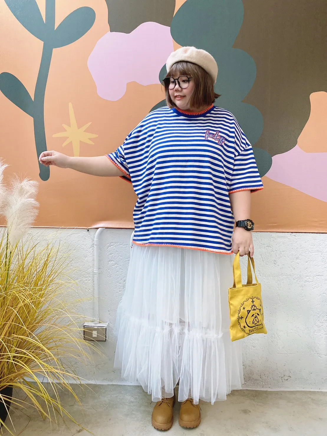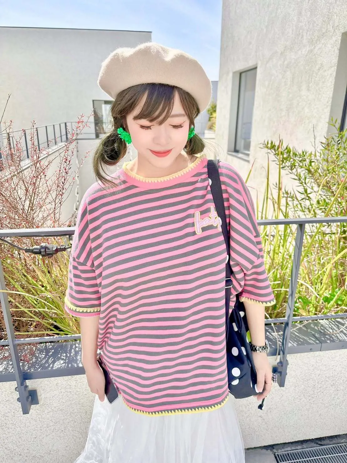 KATZE限量原創款-春夏必備撞色刺繡LOGO橫條上衣 2色